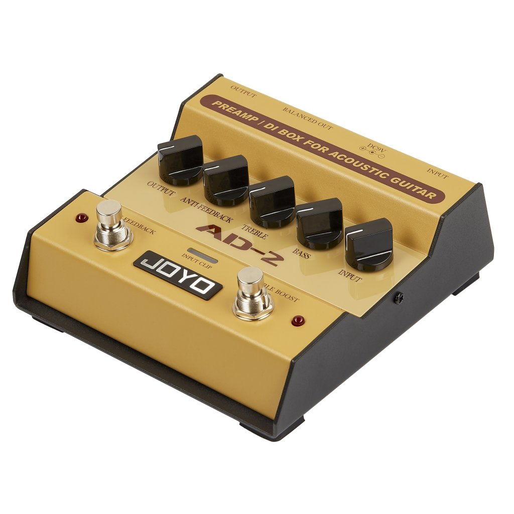 AD-2 je predzosilňovač akustických nástrojov a DI box so zabudovaným dvojpásmovým ekvalizérom (basy, výšky), ktorý vám umožní dosiahnuť požadovaný zvuk. Ak sa vám zvuk stále zdá príliš nevýrazný/utlmený, stlačte nožný prepínač Treble Boost, aby ste zvuk posilnili vo vyšších frekvenciách. Aktivácia funkcie Antifeedback potlačí akýkoľvek šum v podobe možnej spätnej väzby. Indikátor Input Clip vás informuje o tom, či je vstupný signál príliš silný a je potrebné ho stiahnuť príslušným ovládačom Input.