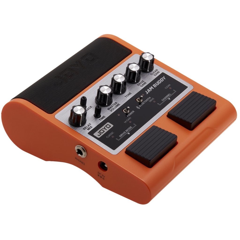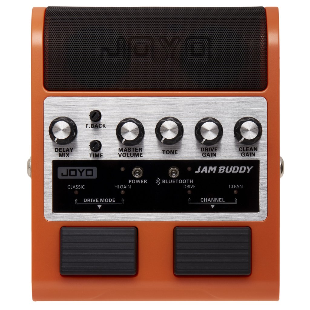 Jam Buddy od spoločnosti Joyo je špecifický produkt. V podstate ide o kompaktné dvojkanálové gitarové kombo na báze pedálu s možnosťou súčasného prehrávania backing/backing skladieb z vášho smatfónu alebo iného zariadenia pomocou technológie Bluetooth. Jamm Buddy tak ponúka dva kanály (Clean a Drive), pričom druhý z nich obsahuje režimy Classic s bluesovým/rockovým nádychom a Hi-Gain. Na prepínanie kanálov a režimov slúžia dva nožný spínače, pričom oba majú samostatné potenciometre gainu a spoločné ovládanie celkovej hlasitosti a EQ. Poteší slúchadlový výstup a vstavaný efekt delay s tromi ovládačmi dĺžky, počtu opakovaní a rýchlosti modulácie efektu.