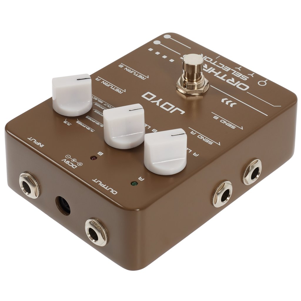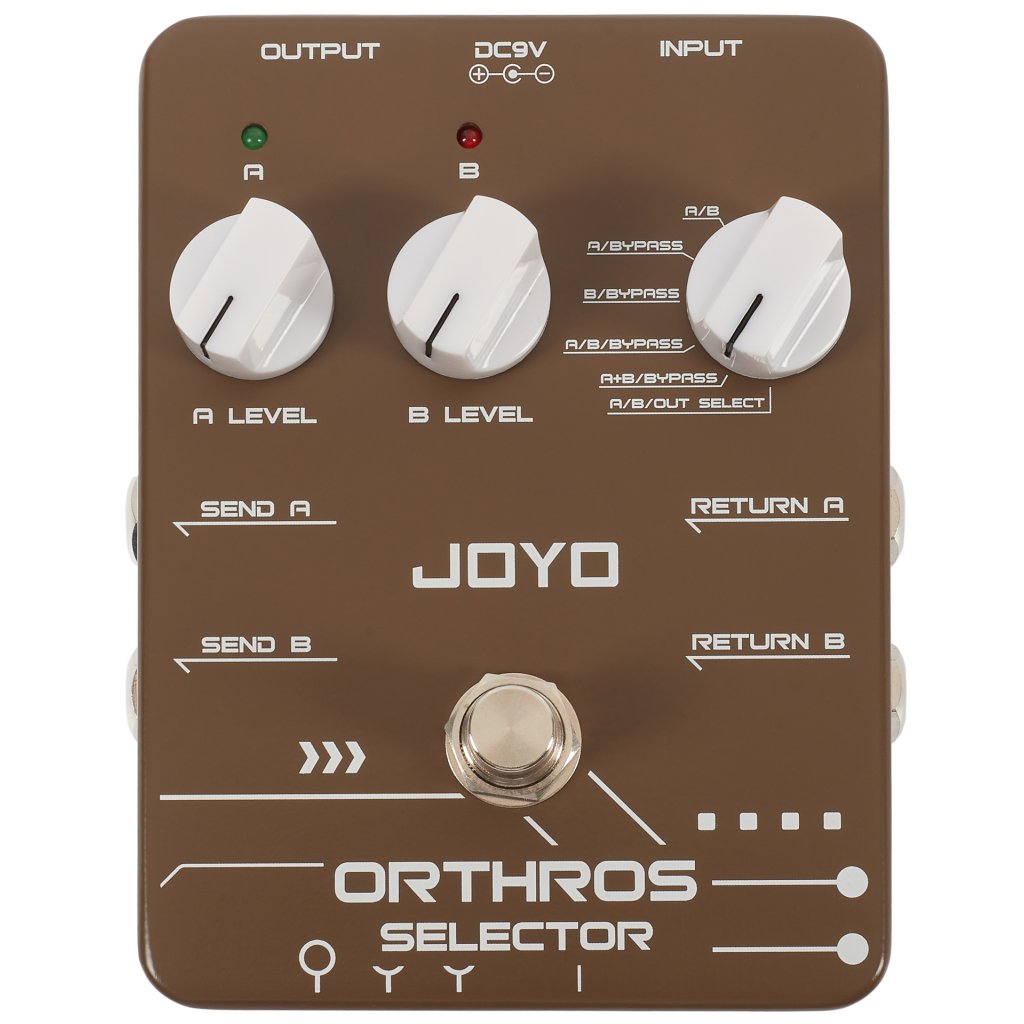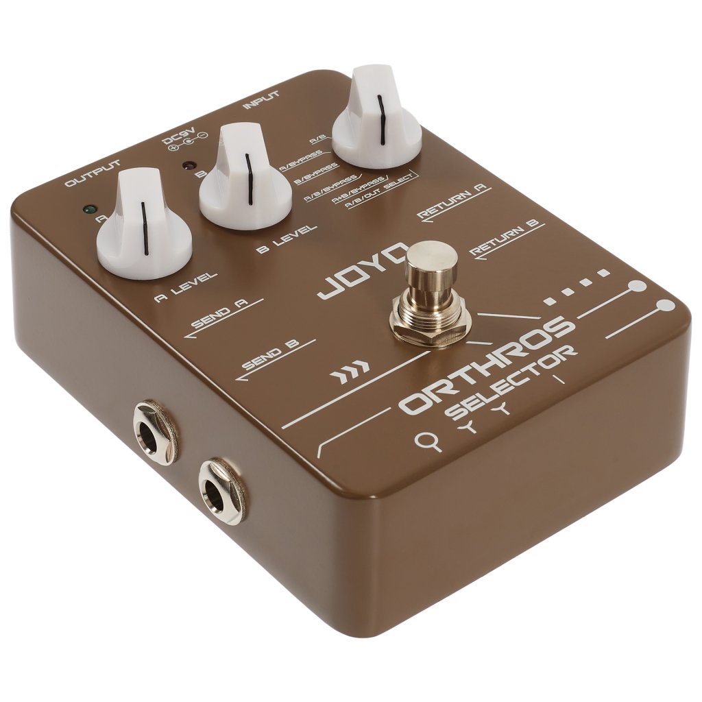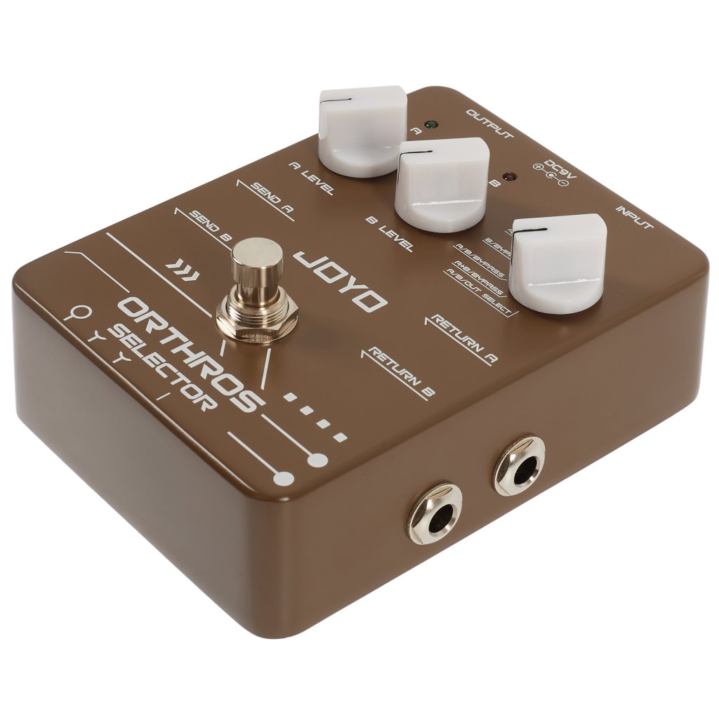 JF-24 ORTHROS SELECTOR je prepínač signálu, ktorý umožňuje prepínať medzi dvoma slučkami (Line A, Line B) a bypass modom v šiestich režimoch (A/B, A/Bypass, B/Bypass, A/B/Bypass, A+B/Bypass, A/B/Out Select). Slučky majú samostatné ovládanie hlasitosti. Na napájanie pedálového efektu je potrebná 9V batéria alebo 9V adaptér (nie je súčasťou balenia).
