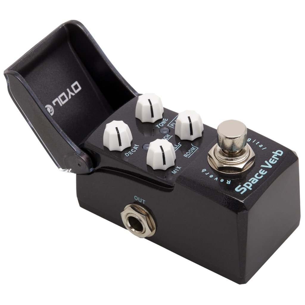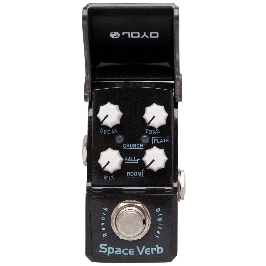 Joyo JF-317 Space Reverb je digitální reverb, který v ultra kompaktní verzi nabízí čtyři klasické zvuky (režimy) tohoto efektu – Room, Hall, Church a Plate. Za málo peněz a minimum prostoru v pedalboardu tak získáte široké možnosti zvukových nastavení efektu reverb od intimního po prostorové echo rezonujících zdí katedrál. Zbylé ovladače určují poměr dry/wet signálu, barvu tónu a délku trvání efektu. Krabička funguje v režimu true bypass, takže ve vypnutém stavu nijak neovlivňuje průchozí signál. K napájení slouží 9V adaptér.