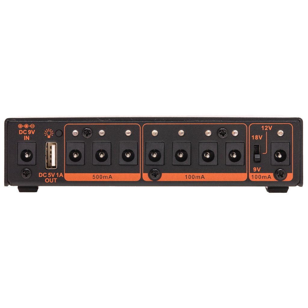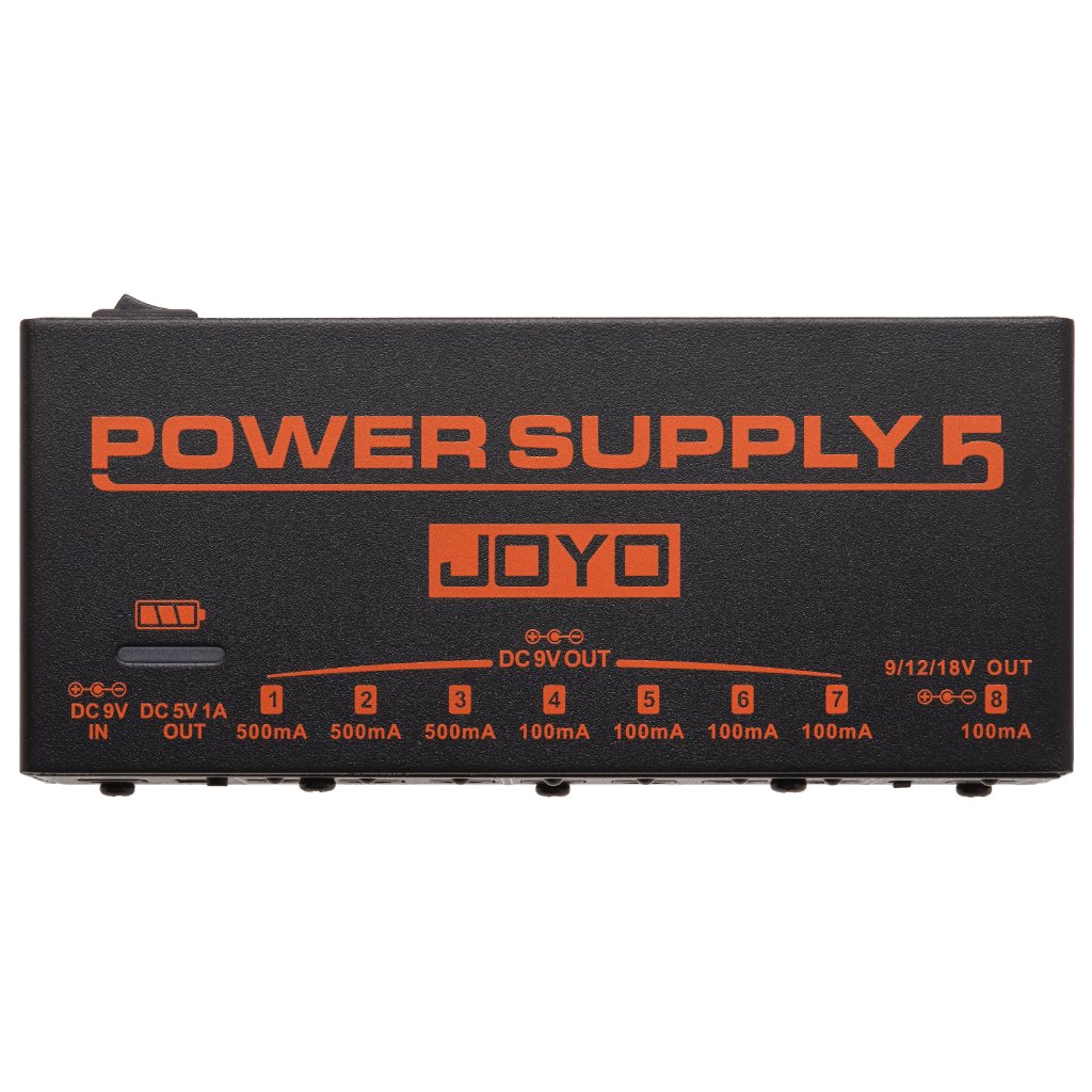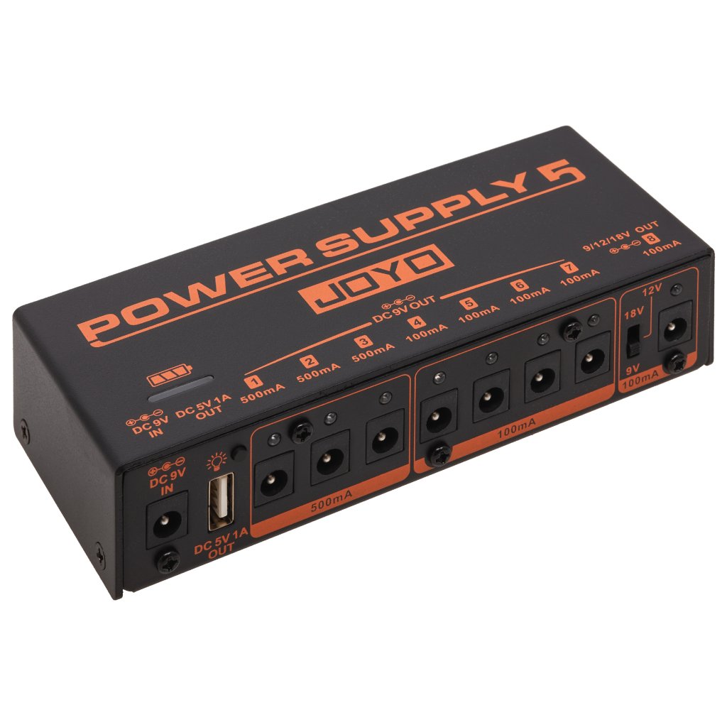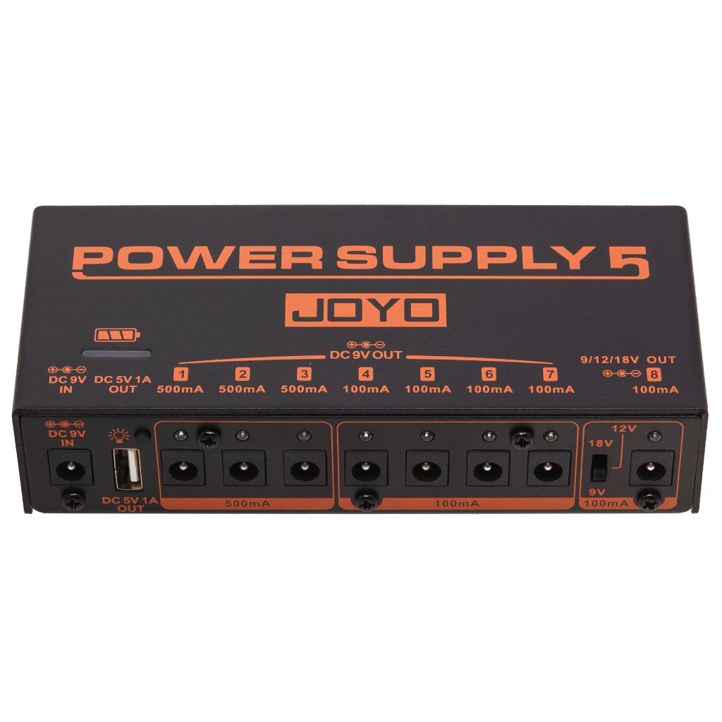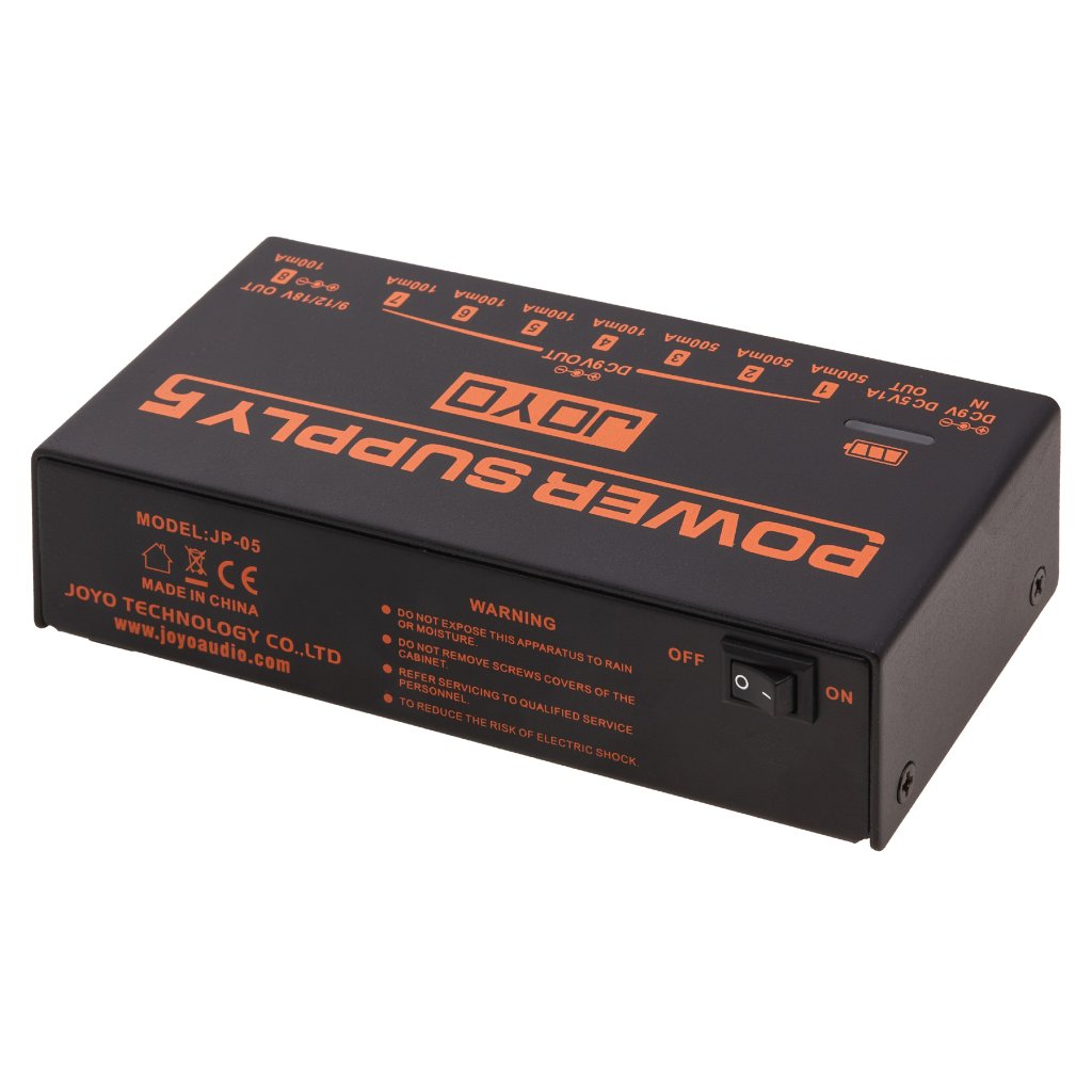 JP-05 je ďalším z radu gitarových multiadaptérov Joyo. Ponúka celkom osem výstupov pre vaše gitarové efekty, konkrétne sedem 9V výstupov (3x 500 mA, 4x 100 mA) a jeden výstup s voliteľným napätím 9, 12 alebo 18 V (100 mA). Pomocou USB portu môžete tiež napájať USB zariadenia alebo nabíjať telefón. Na napájanie samotného multiadaptéra použite 9V DC adaptér (Center Negative), ktorý je súčasťou balenia. Vďaka batériovej prevádzke sa však zaobídete aj bez napájacieho zdroja - vstavané lítiové batérie zvládnu niekoľko hodín nepretržitej prevádzky (až sedem hodín pri použití analógových pedálov a približne dve hodiny pri pripojení digitálnych pedálov). Stav batérie je indikovaný pomocou LED diódy.