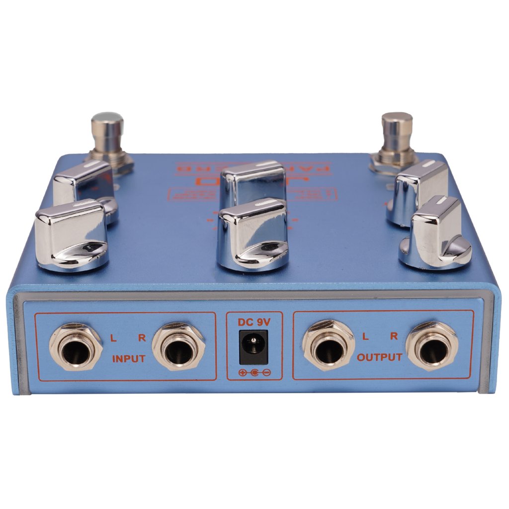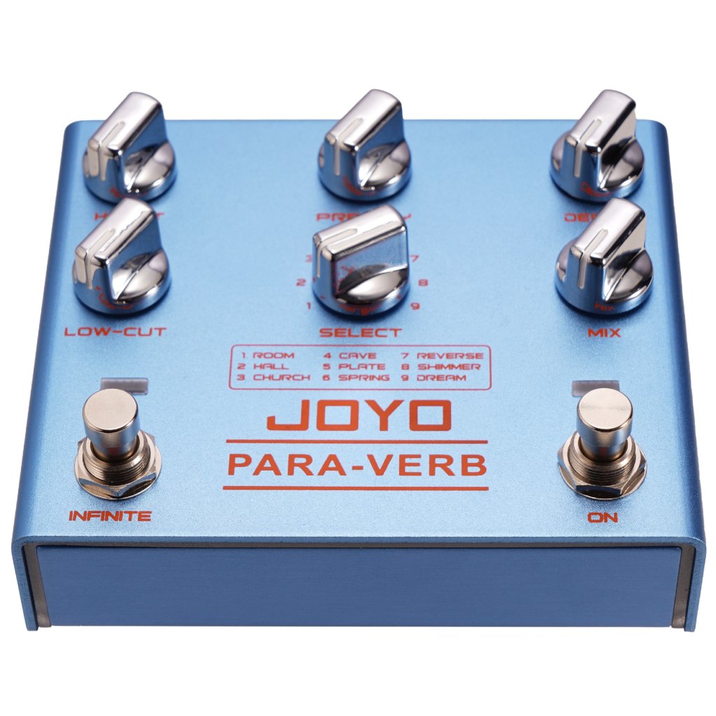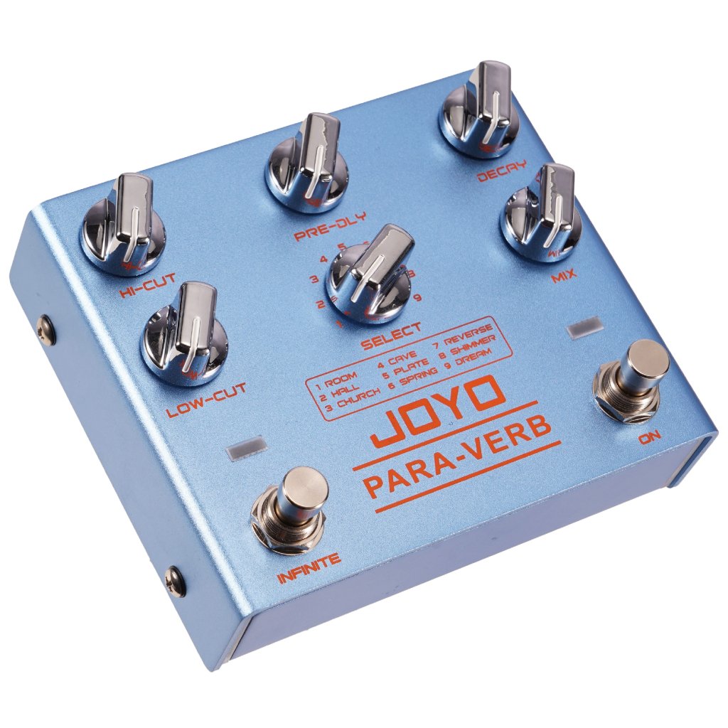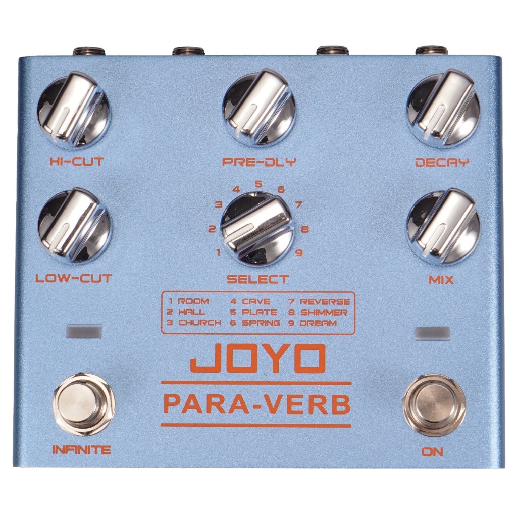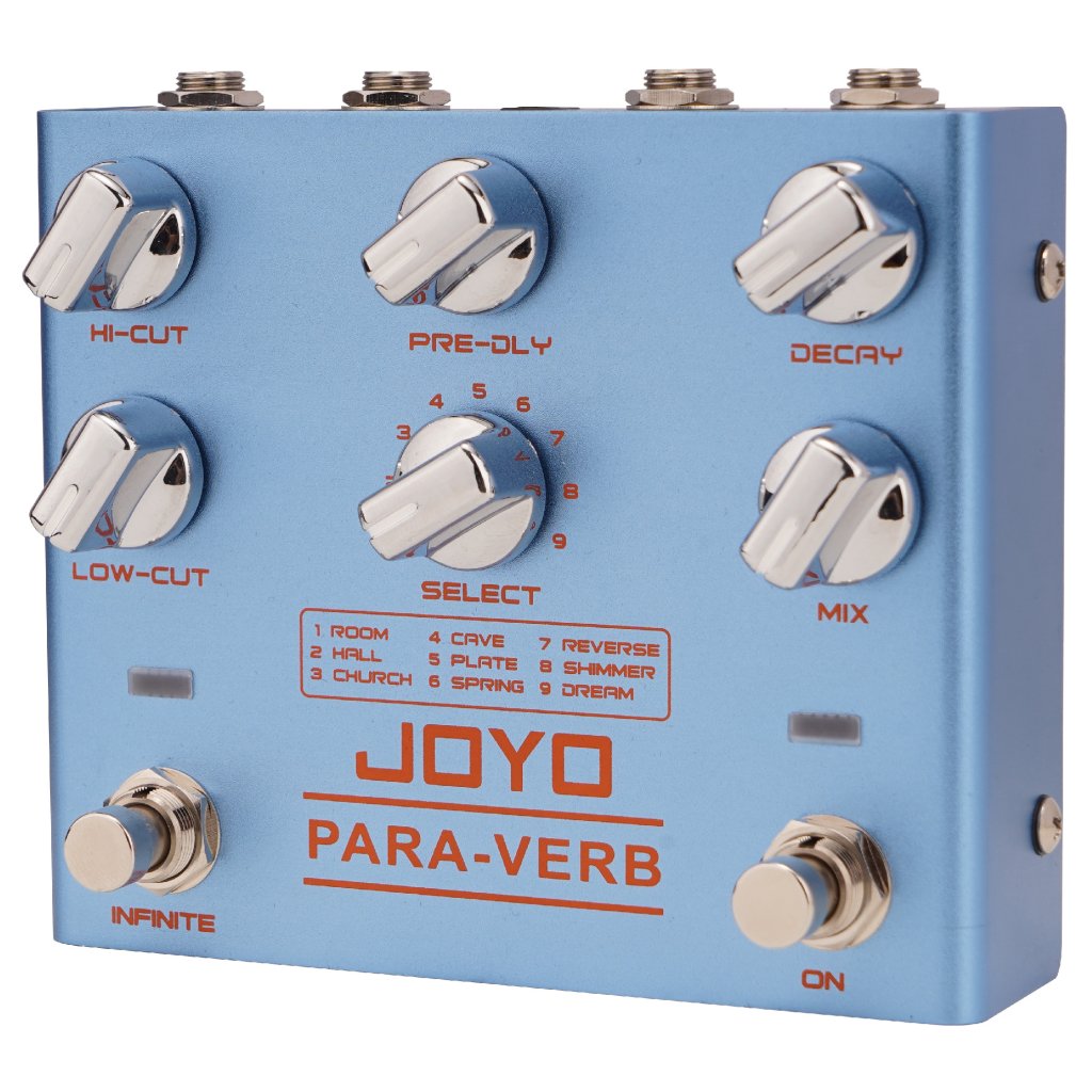 Stereo gitarový reverb Joyo R-31 obsahuje nie jeden, nie dva, ale deväť typov reverbu - Room poskytuje krátke a teplé ozveny miestnosti, Hall je dlhší a priestrannejší, simuluje priestor otvorenej haly, Church poskytuje slávnostnú a obradnú atmosféru kostola a Cave vytvára temnú a hlbokú ozvenu skalnatej jaskyne s nepravidelne tvarovanými stenami. K dispozícii je aj kovovo znejúci Plate, Spring inšpirovaný pružinovými reverbmi starých analógových strojov, Reverse vytvárajúci obrátený, reverzný reverb, Shimmer pridávajúci krásne znejúce oktávy k efektu a nakoniec Dream, ktorý je zmesou jemného viazania, modulácie a zasneného ambientného reverbu. Na ovládacom paneli nájdete filtre Hi-Cut a Low-Cut na úpravu vysokých frekvencií a basov, gombík na nastavenie dĺžky Pre-Delay, Decay na určenie dĺžky oneskorenia efektu, Mix na určenie pomeru suchého a mokrého signálu a prepínač Select na výber typu reverbu. Vďaka funkcii Infinite navyše efekt umožňuje vytvoriť nekonečne doznievajúci tón, ktorý nikdy nezanikne a dodá vášmu zvuku trojrozmernú atmosféru. Vďaka stereo vstupom a výstupom ho možno integrovať do akéhokoľvek efektového reťazca a zachovať jeho priestorovosť. Efekt je zapojený ako True bypass. Na napájanie sa používa štandardný 9V adaptér.