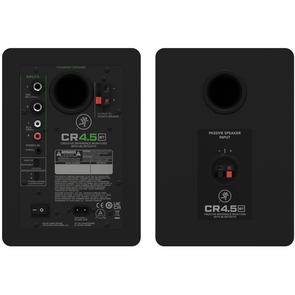Mackie CR4.5BT se prodávají vždy v páru, přičemž jeden z monitorů slouží jako master, obsahuje ovládací prvky i zesilovač a druhý připojíte reproduktorovým kabelem, který je součástí dodávky. Monitory disponují symetrickými vstupy TRS, nesymetrickými RCA a také stereo vstupem pro rychlé připojení telefonu či notebooku.