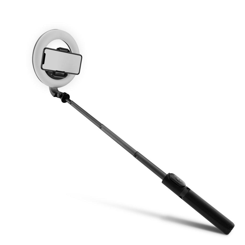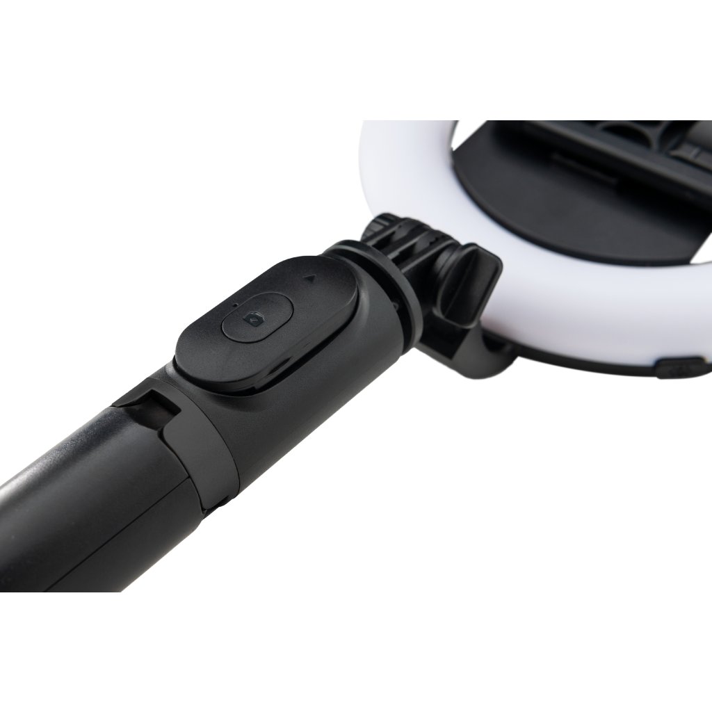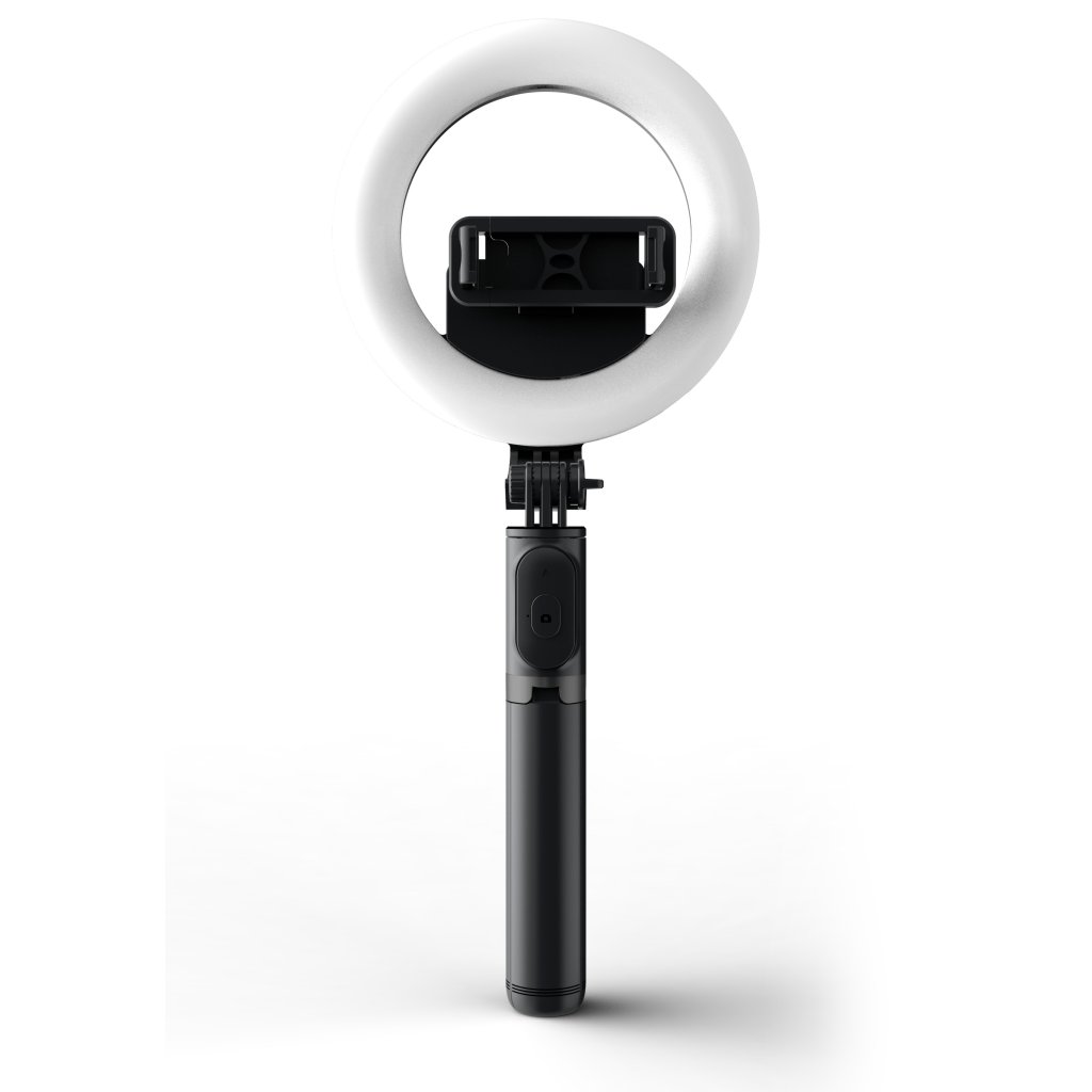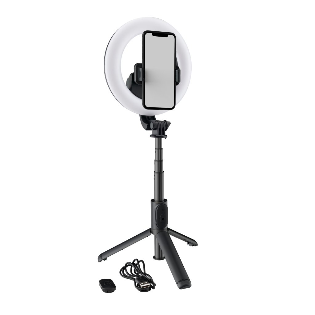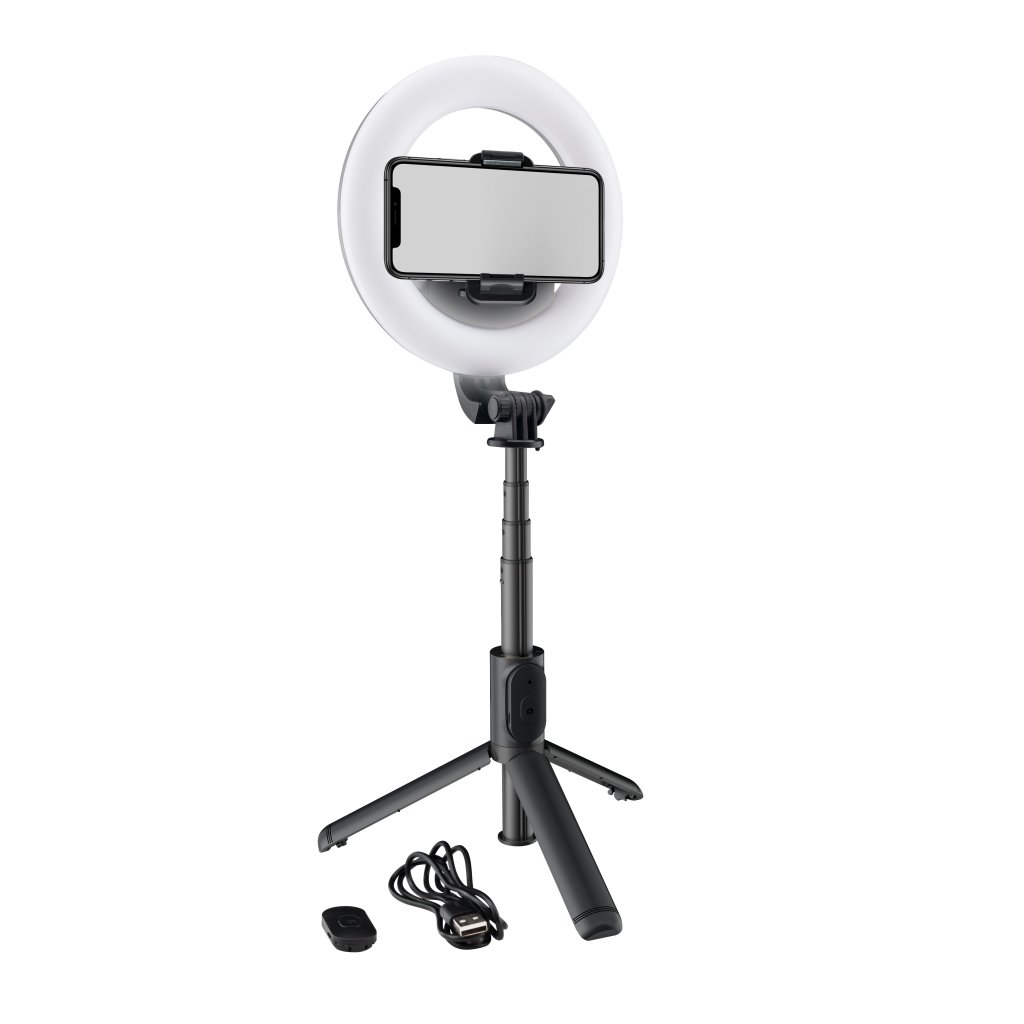 Kompaktná súprava príslušenstva vhodná na natáčanie videí, podcastov a vlogov, ktorá obsahuje svetelný prstenec LED s priemerom 6" a integrovanou batériou, teleskopickú selfie tyč s možnosťou rozloženia na statív, vstavaný držiak na mobilný telefón s možnosťou otáčania o 360° a diaľkové ovládanie na ovládanie svetla na väčšiu vzdialenosť. S touto sadou získajú vaše videá profesionálnu kvalitu a noví diváci sa len pohrnú. Batériu môžete nabíjať pomocou priloženého kábla USB.