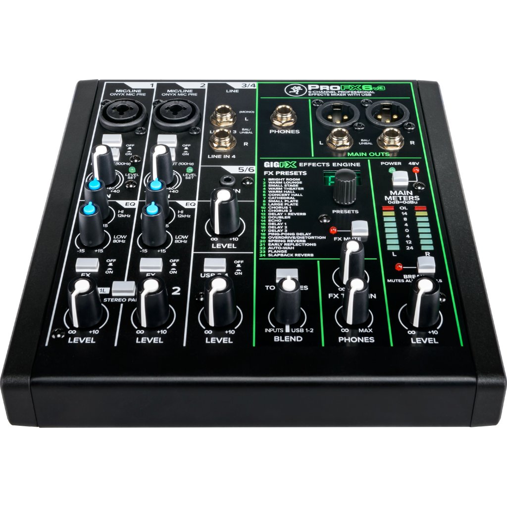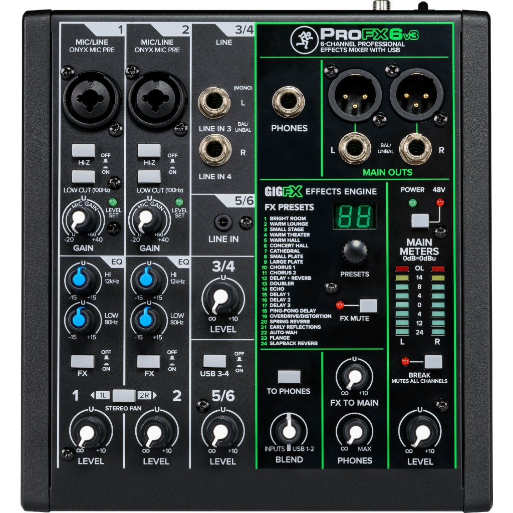 Konkrétne ProFX6v3 je šesťkanálový mixážny pult s dvoma predzosilňovačmi Onyx a zvukovým strojom GigFX. Zvuk možno upravovať pomocou intuitívnych ovládacích prvkov a dvojpásmového ekvalizéra a okrem dvoch kombinovaných vstupov XLR/Jack je konzola vybavená aj vstupom Hi-Z na priame pripojenie gitary/basgitary, stereo vstupom Jack a vstupom Line IN pre hudobný prehrávač alebo mobilné zariadenie. Nájdete tu aj výstup na monitor, hlavný výstup a výstup na slúchadlá.
