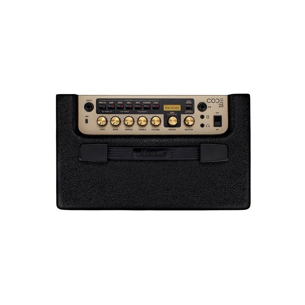 Modelingové kombo s výkonom 25W a reproduktorovým osadením 1x10. Kombo Code 25 je ideálnym pomocníkom pre všetkých gitaristov, ktorí chcú mať poruke nekonečné zvukové možnosti na klubových koncertoch alebo v štúdiu. Code 25 je vybavený technológiou MST, ktorá vznikla zo spolupráce značky Marshall a softwareových majstrov Softube. Výsledkom je dokonalý modeling vintage, ale aj aktuálnych zosilňovačov značky Marshall. Na výber máte viac ako 100 hotových presetov, 14 modelov predzosilňovačov, 4 modely koncových zosilňovačov a 8 gitarových reproboxov. Okrem toho je možné využívať naraz až 5 z celkového množstva 24 efektov. Samozrejmosťou je trojpásmový EQ, Gain, Volume, Pre FX a kompletné rozhranie pre ovládania modelingovej časti aparátu. Code 25 je kompatibilný s USB, takže je možné ho použiť ako rozhranie pre ľubovoľný DAW. Novinkou je aj Bluetooth konektivita vďaka ktorej je možné cez kombo streamovať hudbu bezdrôtovo. Rozmery: 350 x 340 x 215 mm, hmotnosť: 6,1 kg.