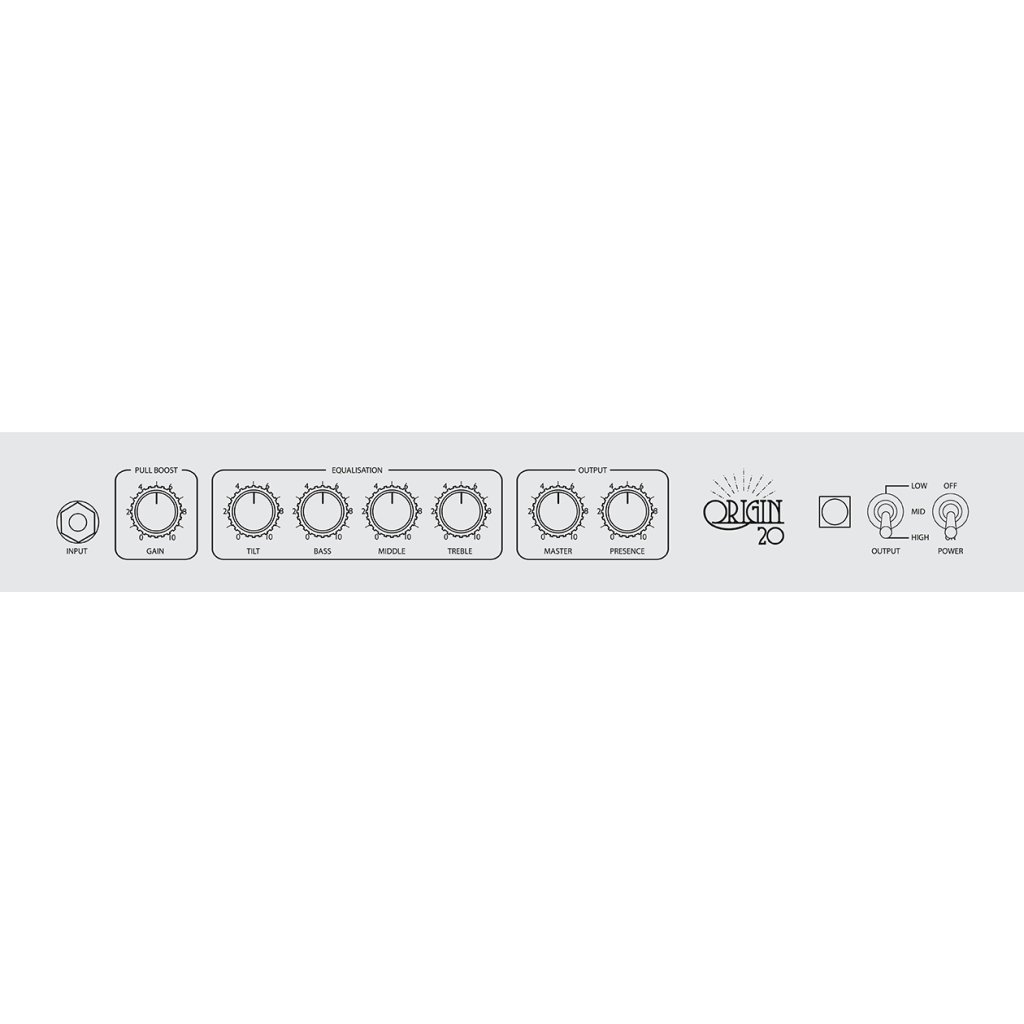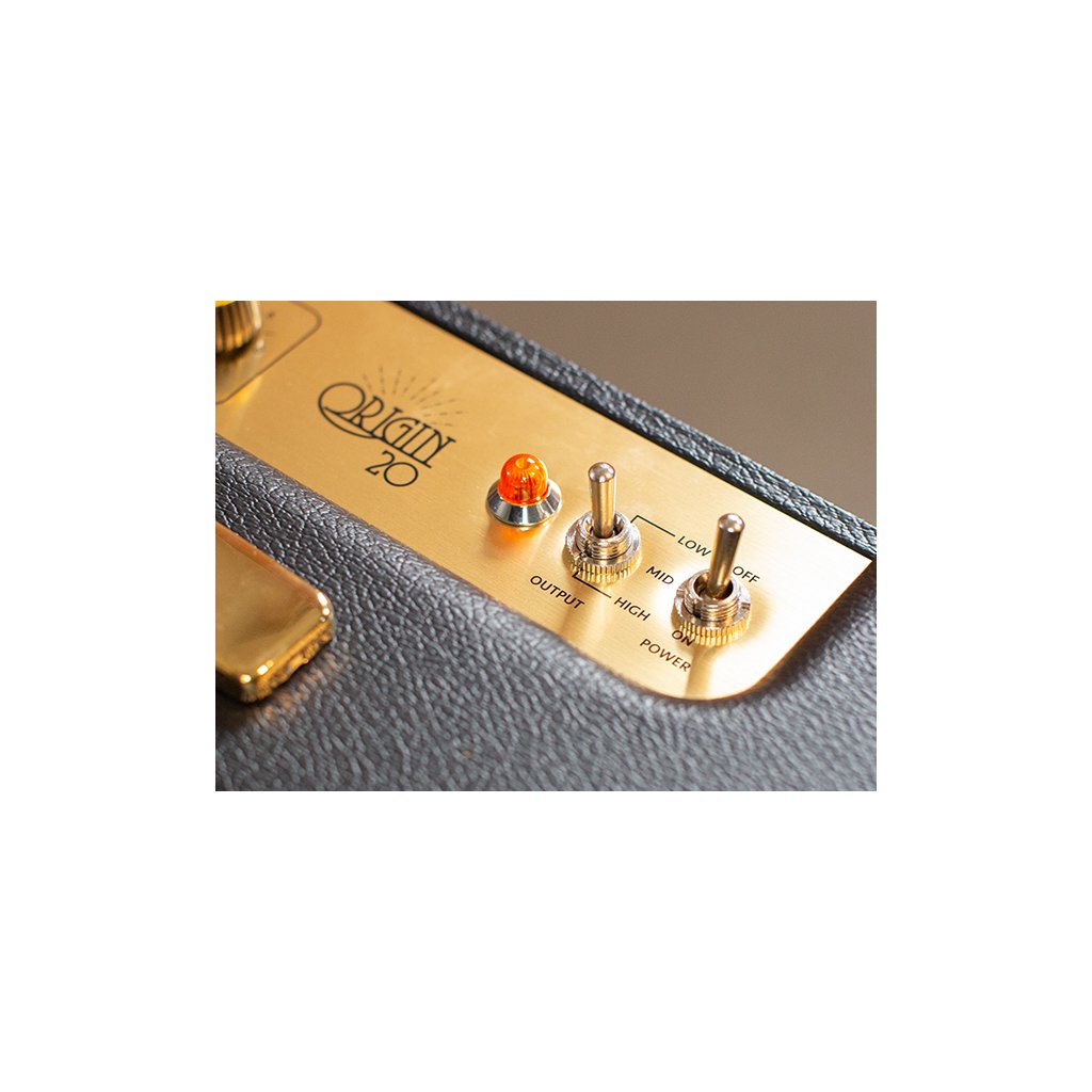Origin 20C je jednokanálové kombo s maximálnym výkonom 20 W, ktorý môžete stlmiť pomocou prepínača Output na prednom paneli. Technológia Powerstem zaručuje rovnako kvalitný zvuk aj pri nižších úrovniach výkonu. Osvedčená kombinácia predzosilňovača/napájacej lampy s 10-palcovým reproduktorom Celestion typu V dodáva kombu typický britský zvuk. Na úpravu zvuku sa používa trojpásmový ekvalizér s pridaným ovládačom Tilt na podrobnejšie nastavenie vysokých frekvencií. Vďaka funkcii Pull Boost, t. j. push/pull ovládača Gain, môžete zvýšiť hlasitosť aj gain aparátu a vrátiť zvuk až do vôd hard/rocku 80. rokov.