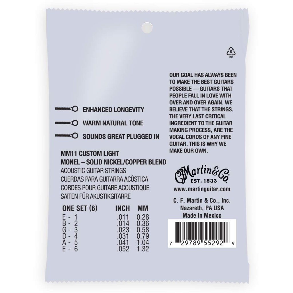 Spoločnosť Martin prichádza s vintage strunami, ktorých zvuk pripomína pôvodne nástroje z počiatku dvadsiateho storočia. Unikátna konštrukcia podporí prirodzený zvuk vašej akustickej gitary a vdýchne jej nový život. Precízne valcovité vinutie z Monel, čo je veľmi pevná zliatina niklu a medi, vylučuje prakticky akékoľvek poškodenie povrchu strún a následnú koróziu. Jasný a konzistentný tón tak zostane zachovaný po dlhú dobu. Ďalším špecifikom je upravená hrúbka strún A, D a H prinášajúca vyvážený pocit z hry a presnejšiu intonáciu.