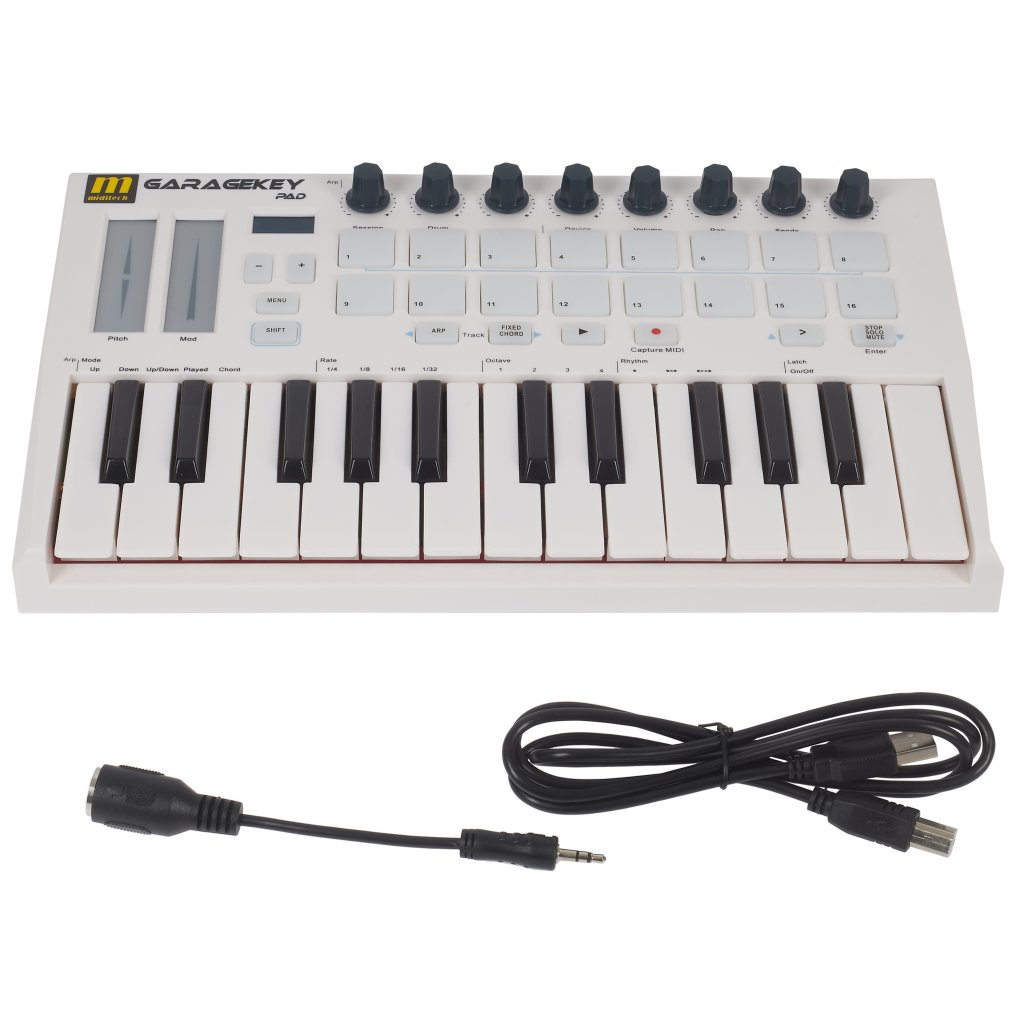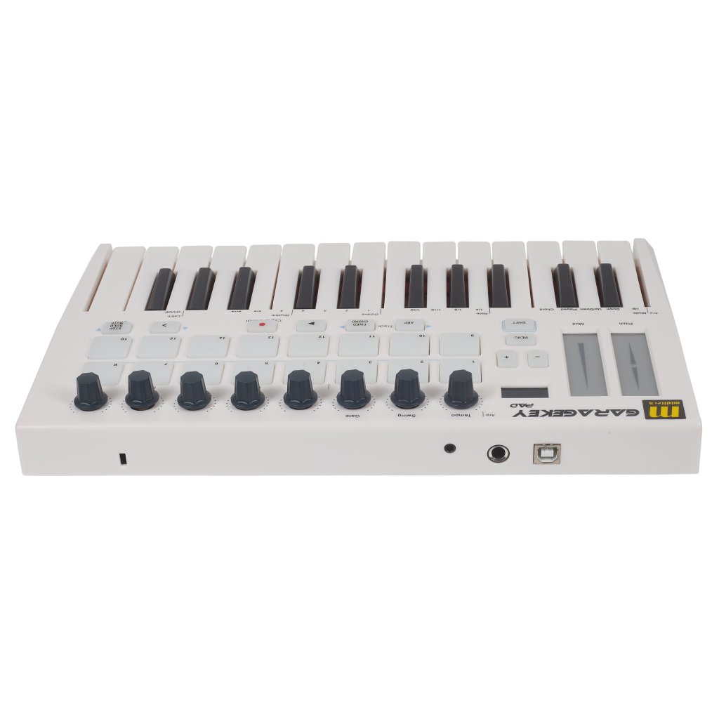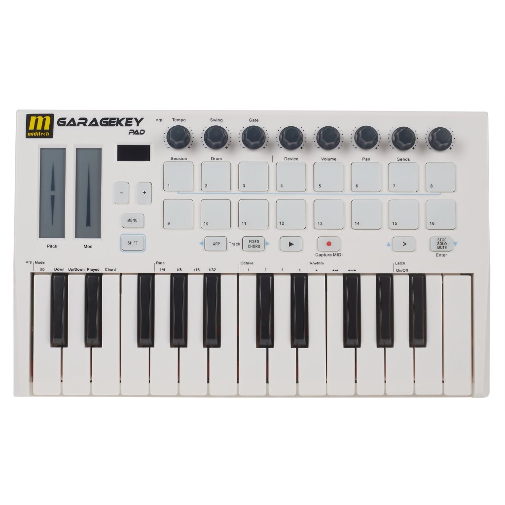 MIDITECH Garagekey PAD II je praktická mobilná klávesnica na cesty. Má dvadsaťpäť dynamických klávesov. Je kompatibilný s väčšinou programov DAW, takže každý parameter možno priradiť jednému zo šestnástich RGB padov s nastaviteľným bodom prítlaku alebo jednému z ôsmich gombíkov. Na nastavenie výšky tónu slúži tzv. páskový ovládač, ktorý sa ovláda potiahnutím prsta. Na jednoduchú orientáciu sa používa prehľadný displej OLED. Bonusom je výstup MIDI, vstup pre sustain pedál a rozhranie USB 2.0.