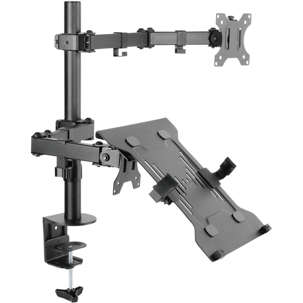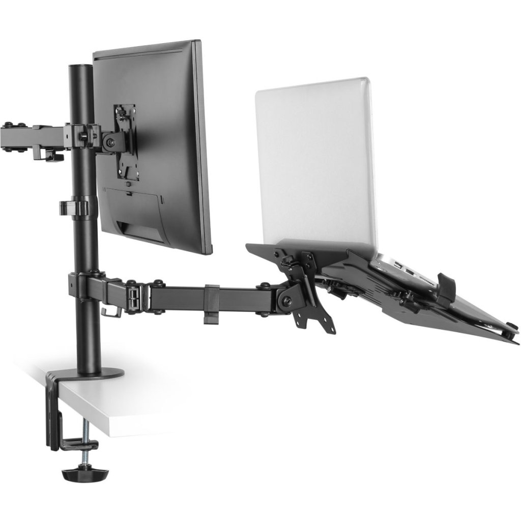 Univerzálny stojan pre notebook a externý monitor s nastaviteľným uhlom vhodný do kancelárie, domácej pracovne alebo nahrávacieho štúdia. Stojan je možné pripevniť pomocou skrutky so závitom k doske stola s hrúbkou až 88 mm. Stojan má tiež integrovaný manažment káblov a je vyrobený z odolnej a pevnej ocele. Stojan je vhodný pre notebooky do veľkosti 15,6" a monitory od 13 do 32".