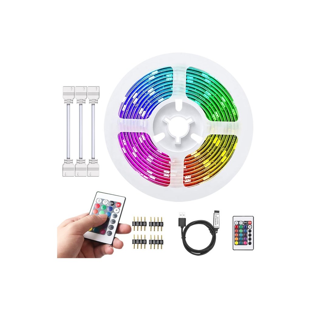 Univerzálny LED pásik s diódami SMD RGB vhodný na podsvietenie televízora, stola, kuchynskej linky, postele, okna alebo bicích či gitary a basy. Súprava obsahuje štyri polmetrové LED pásy, tri rohové nadstavce na vytvorenie vzoru, USB adaptér a diaľkové ovládanie na pohodlné prepínanie a nastavovanie z gauča. K dispozícii budete mať nespočetné množstvo farebných kombinácií, stmievanie, stroboskop a mnoho ďalších efektov.
