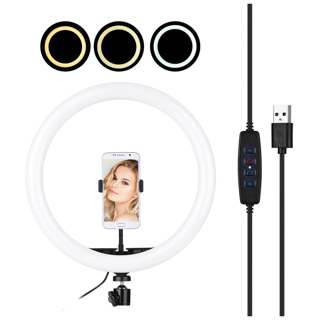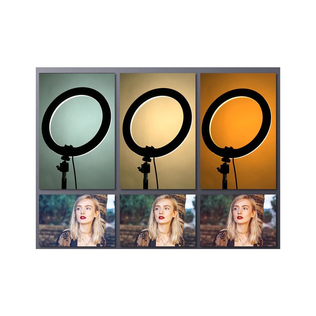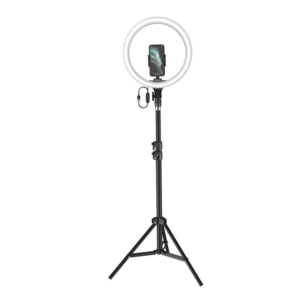 Univerzálne kruhové LED svetlo s priemerom 30 cm s teplou, prirodzenou a studenou bielou farbou vhodné pre začínajúcich youtuberov, influencerov, fotografov a podcasterov. Svetlo prenáša tri odtiene bielej a dodáva vášmu videu dokonale vyvážený obraz, ktorý úplne odrovná konkurenciu. Súprava obsahuje aj dvojmetrový kábel USB, držiak na smartfón a stabilný stojan s nastaviteľnou výškou.