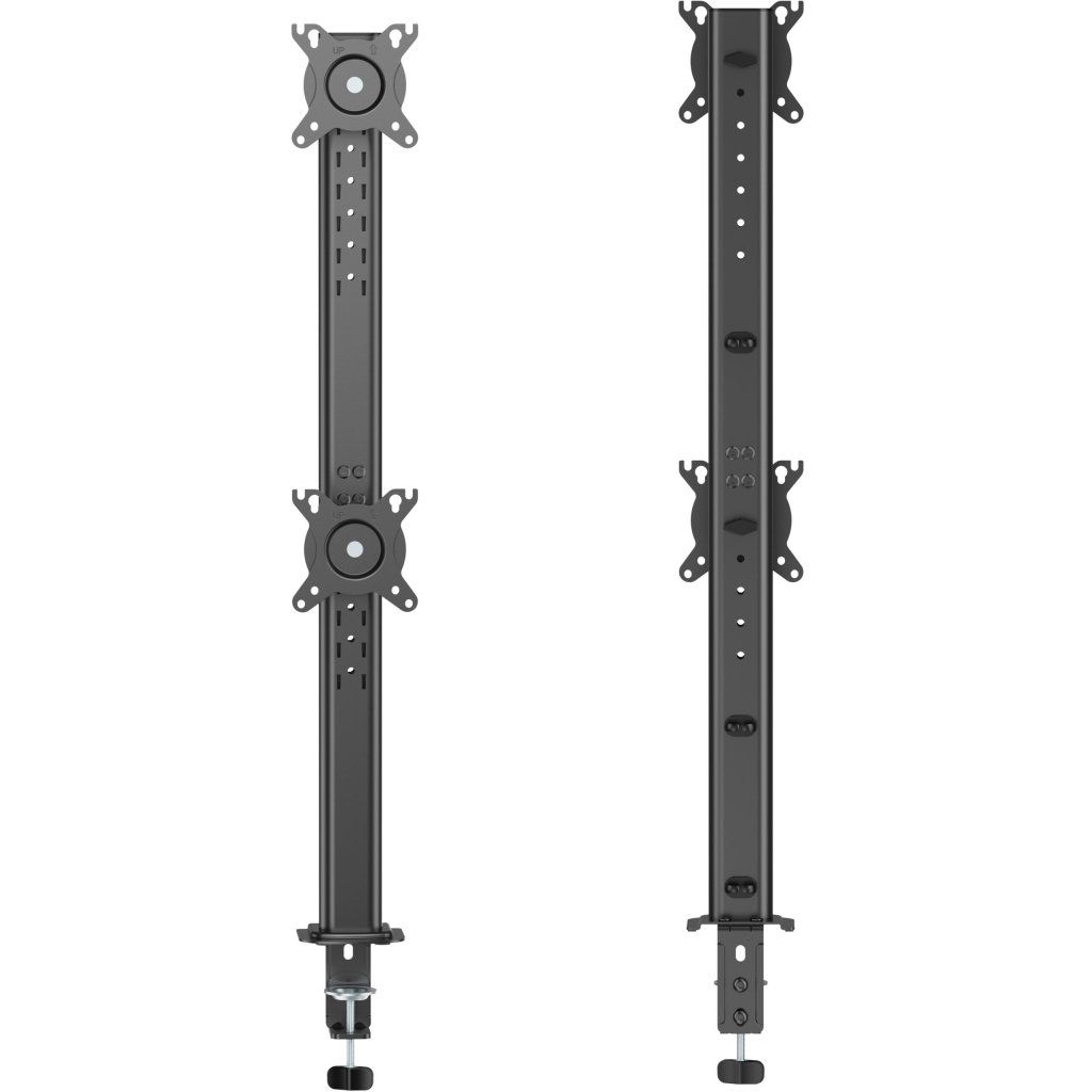 Držiak podporuje monitory so štandardom VESA 75×75 a 100×100 a zvládne zaťaženie až 12 kg na každé rameno, vrátane zakrivených displejov. Ponúka široké možnosti nastavenia – naklonenie +45° až -45°, otočenie do strán +30° až -30° a otočenie o 180° pre vertikálnu orientáciu. Výšku je možné nastaviť pozdĺž stĺpika s dĺžkou 843 mm a zaistiť pomocou bezpečnostného mechanizmu. Praktický je aj systém bez použitia náradia pre rýchle nastavenie.