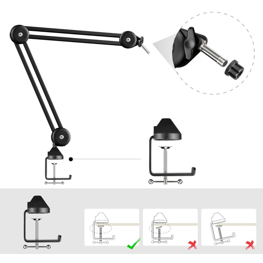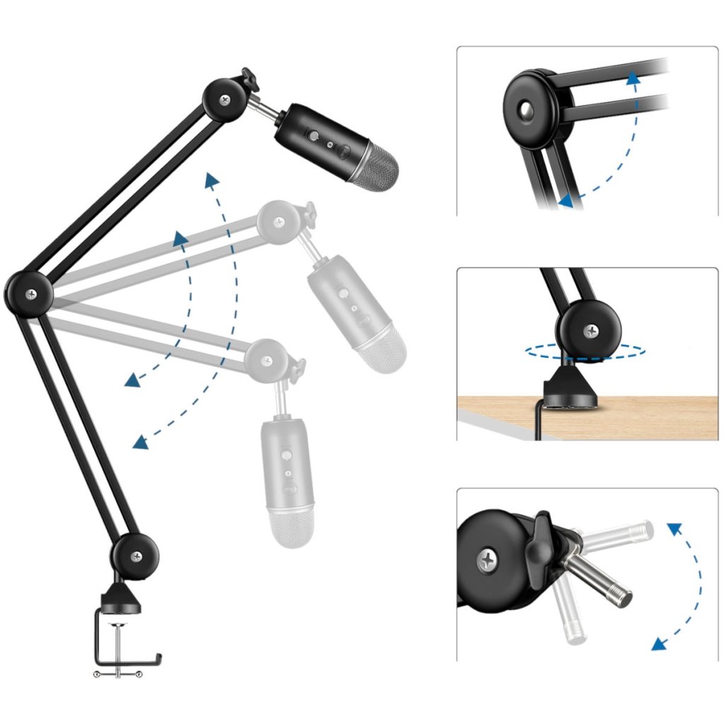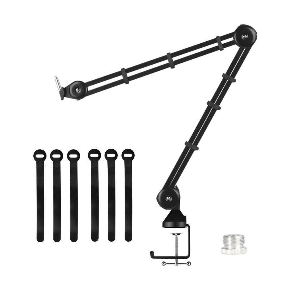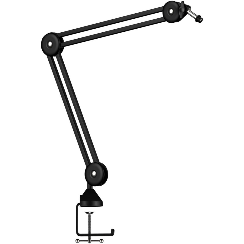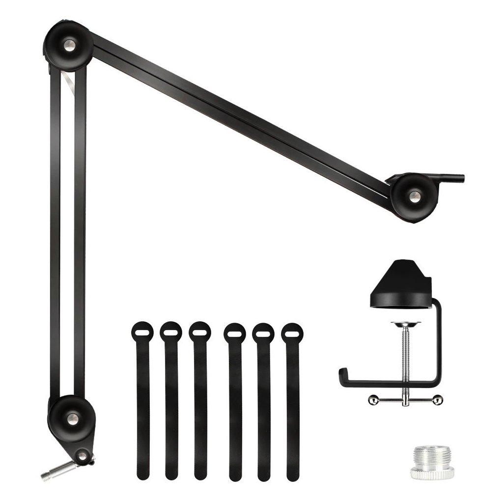 Špičkový stolný mikrofónový stojan vhodný na živé rozhlasové vysielanie, nahrávanie dabingu alebo vytváranie originálnych videí pre váš kanál YouTube. Na mikrofónový stojan môžete umiestniť všetky typy mikrofónov, robustné kovové rameno unesie hmotnosť až 1,2 kg a navyše sa dá bez problémov otáčať o 360°. Ľahká a odolná konštrukcia vám umožní stojan ľahko uložiť alebo premiestniť na ľubovoľné miesto vo vašom domácom štúdiu. Vďaka protišmykovej svorke môžete držiak umiestniť na stôl s hrúbkou do 60 mm s hladkým alebo lesklým povrchom. Súčasťou balenia je redukcia so závitom a šesť pásikov so suchým zipsom na dokonalé vedenie káblov.