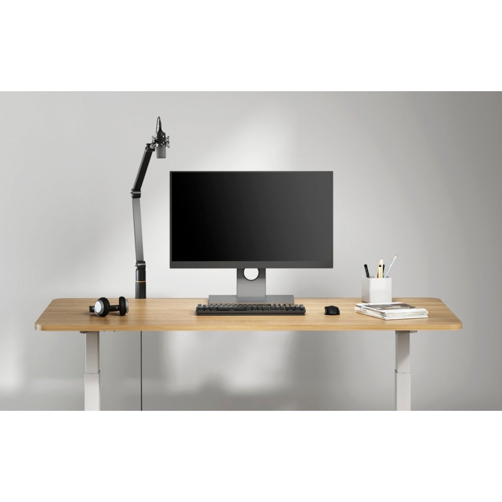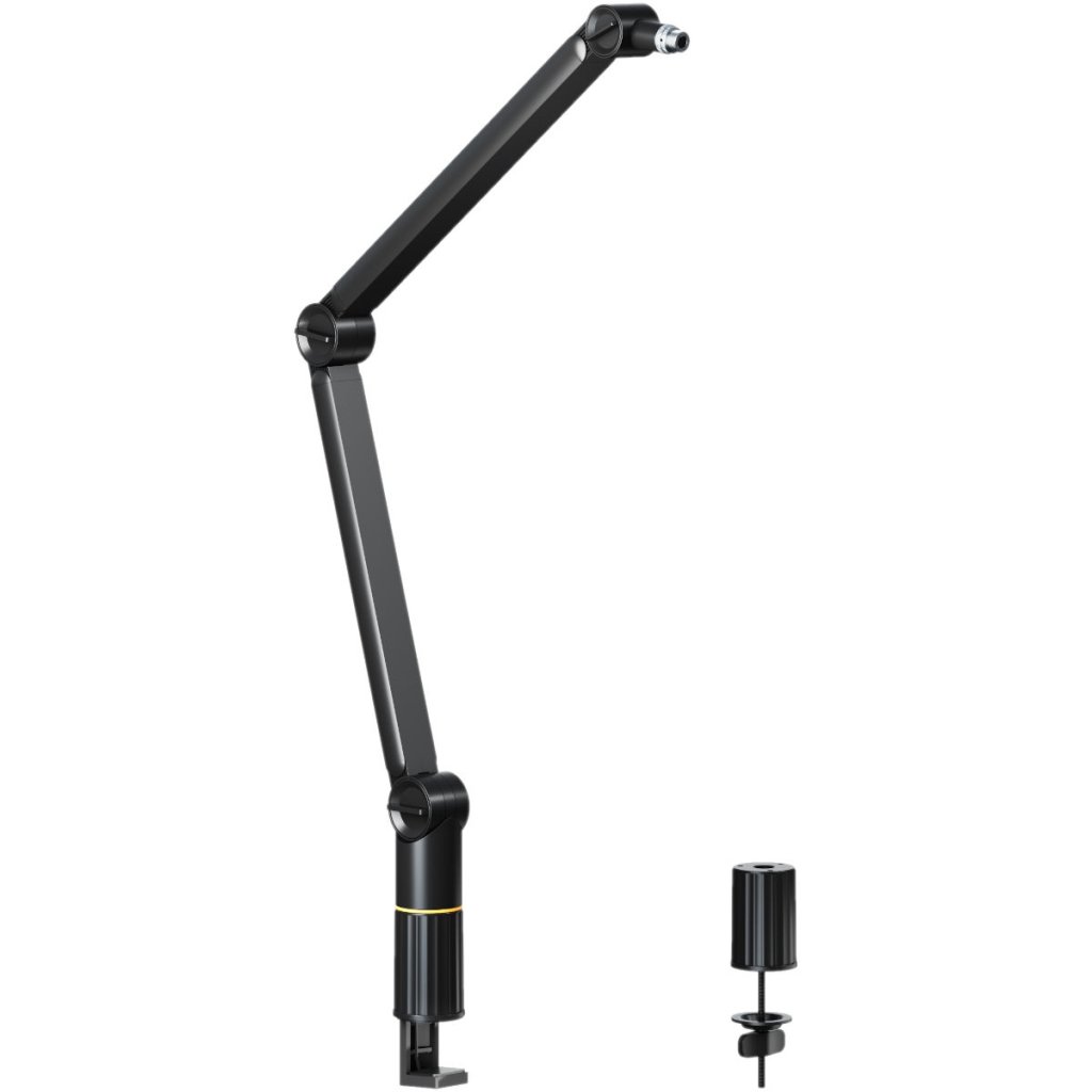 Prvotriedny mikrofónový stojan vhodný pre všetkých kreatívcov a zvukových nadšencov, ako aj pre študentské rádio, živé vysielanie alebo youtubing. Stojan je vyrobený z kombinácie ocele, plastu a hliníka, má integrovaný manažment káblov, možnosť otáčania o 360 stupňov a v neposlednom rade pohodlné nastavenie sklonu a výšky. Stojan sa upevňuje pomocou závitu na dosku stola s výškou do 60 mm. Súčasťou balenia je redukcia so závitom 5/8".
