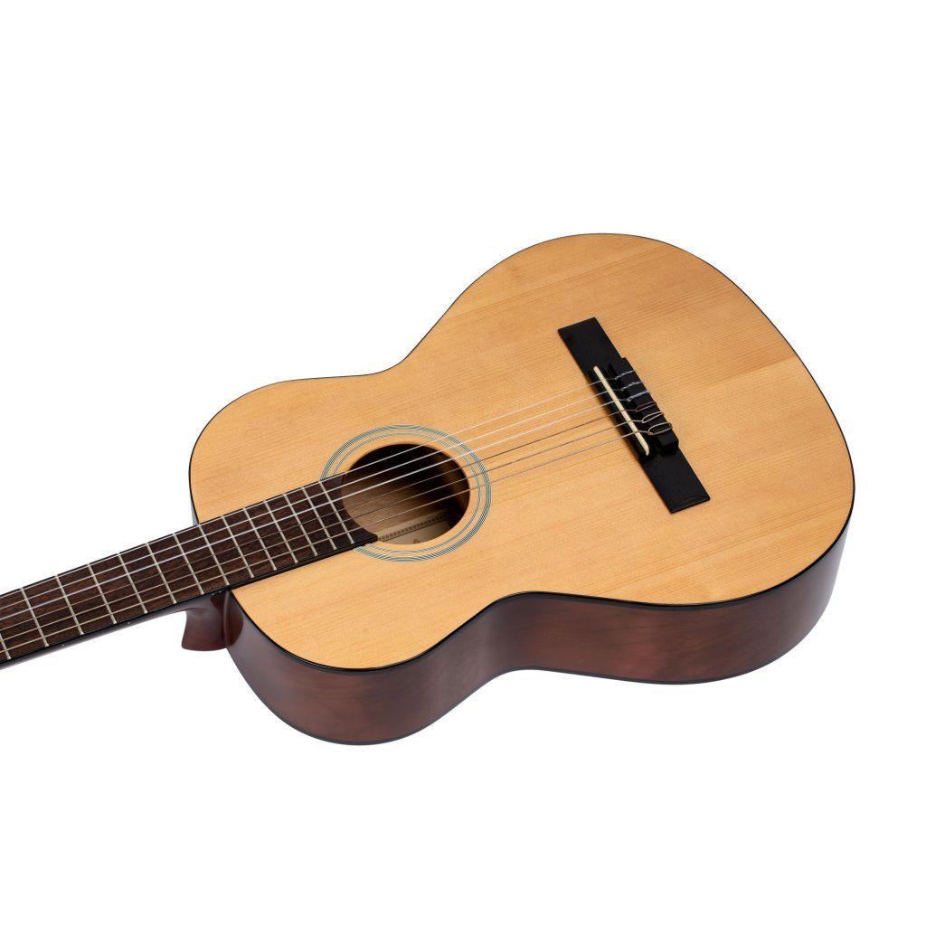 Táto klasická gitara trojštvrťovej veľkosti je vhodná pre deti a mladých študentov hudobných škôl, ktorých drobnejším prstom je prispôsobený užší krk a kratšia menzúra gitary. Telo nástroja je zhotovené zo smreku a Catalpa, k mahagonovému krku prišiel hmatník z orecha osadený osemnástimi pražcami. Strohý dizajn jemne prizdobuje čierna lemovka z materiálu ABS a logo na hlavici gitary.