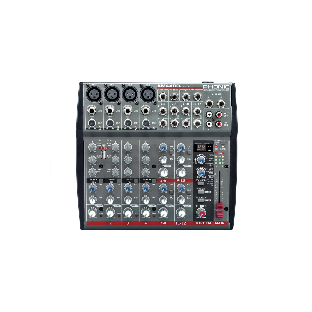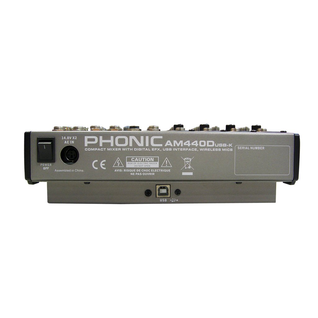 Phonic AM440D USB-K je klasický model AM rozšířen o USB rozhraní plug-and-play pro stereofonní nahrávání. To umožňuje pořizovat stereofonní nahrávky i v pohodlí vašeho domova se vzorkovacími frekvencemi vyššími než je tomu u zvukových disků CD. Další USB port byl přidán pro přímé připojení bezdrátových mikrofonních přijímačů UTM Phonic, což umožňuje použít až dva bezdrátové mikrofony USB, jejichž signál může být veden přímo do mixážního pultu.