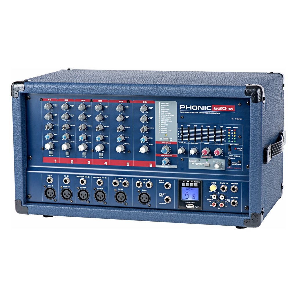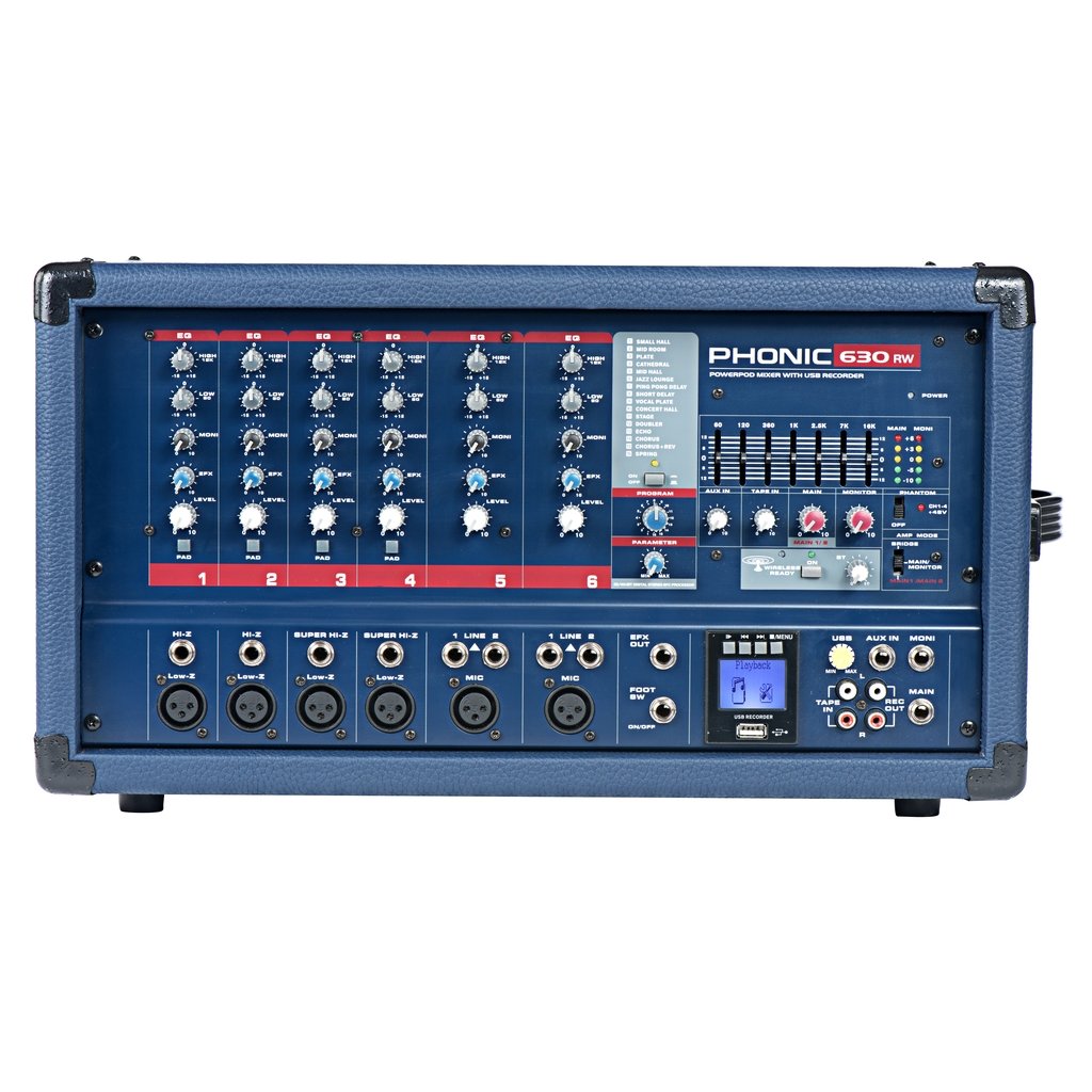 Phonic Powerpod 630 RW je univerzální power mix zabudovaný do kompaktní a odolné lisované skříně. Má vestavěný stereofonní zesilovač, který lze přemostit a propojit. Vstupy Super Hi-Z umožňují přidání kytar a dalších nástrojů. Součástí jednotky je také USB rekordér/přehrávač, který umožňuje nahrávání hlavního mixu na libovolné standardní paměťové zařízení USB. Jednotky také nabízejí digitální efekty s vysokým rozlišením a 16 přednastavenými programy, z nichž každý má vlastní uživatelsky definovatelný parametr. Dvoupásmový ekvalizér na každém kanálu a dvojitý vícepásmový grafický ekvalizér s volitelnými přepínači In/Out poskytují maximální kontrolu nad mixem. Powerpod 630 RW má navíc vestavěný modul Bluetooth, který nabízí streamování zvuku z mobilního zařízení podporujícího technologii Bluetooth.