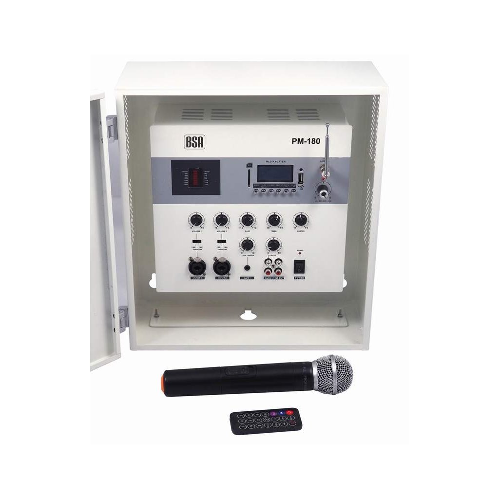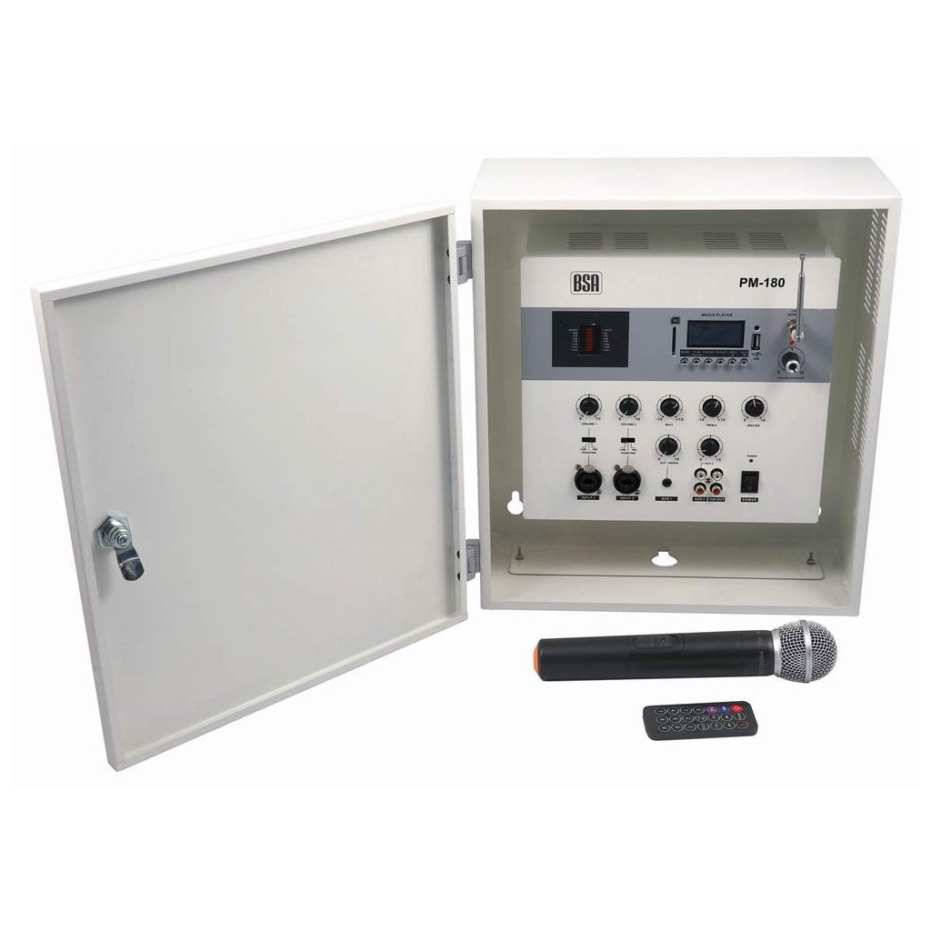 Nástenný zosilňovač BSA s bezdrôtovým mikrofónom * 180W * 100V/4-16ohm * USB/SD/MP3 s Bluetooth