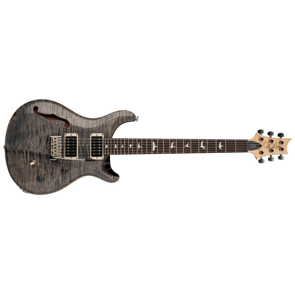 Model CE 24 Semi-Hollow Faded Gray Black kombinuje ergonomický tvar elektrických gitár PRS s konštrukciou polodutého tela. Mahagónové telo gitary zdobí efektná figurovaná javorová vrchná doska a lesklý nitrolak. K javorovému krku s profilom Pattern Thin je prilepený palisandrový hmatník s dvadsiatimi štyrmi pražcami. Orientáciu na hmatníku uľahčujú polohové značky v podobe perleťových siluet vtákov.