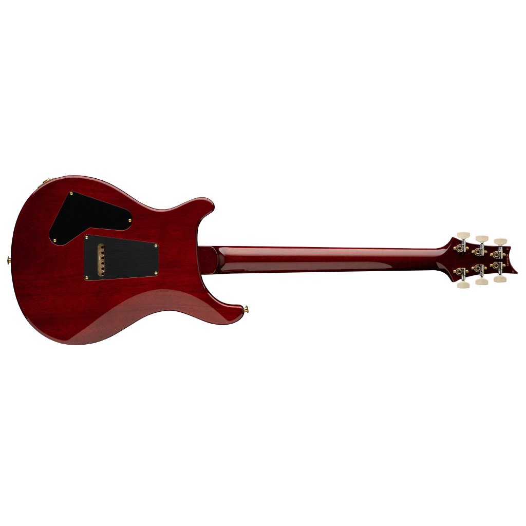 Model Custom 24-08 Dark Cherry Sunburst na prvý pohľad zaujme kombináciou ergonomicky tvarovaného mahagónového tela s typickým PRS dvojitým výrezom a figurovanou javorovou vrchnou doskou s chladnou kresbou dreva. Na jednodielny mahagónový krk s profilom Pattern Thin nadväzuje palisandrový hmatník s dvadsiatimi štyrmi pražcami. Orientáciu na hmatníku uľahčujú značkové PRS pozičné značky v podobe perleťových siluet vtákov.