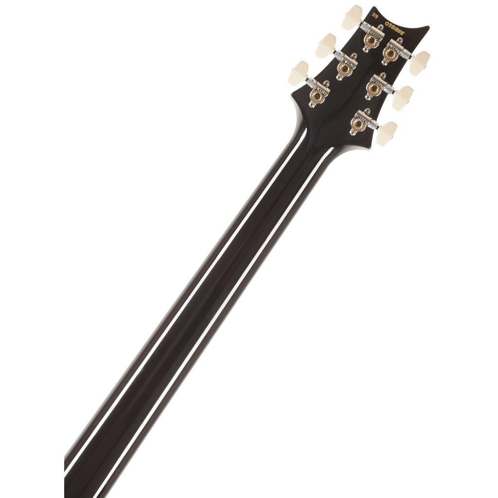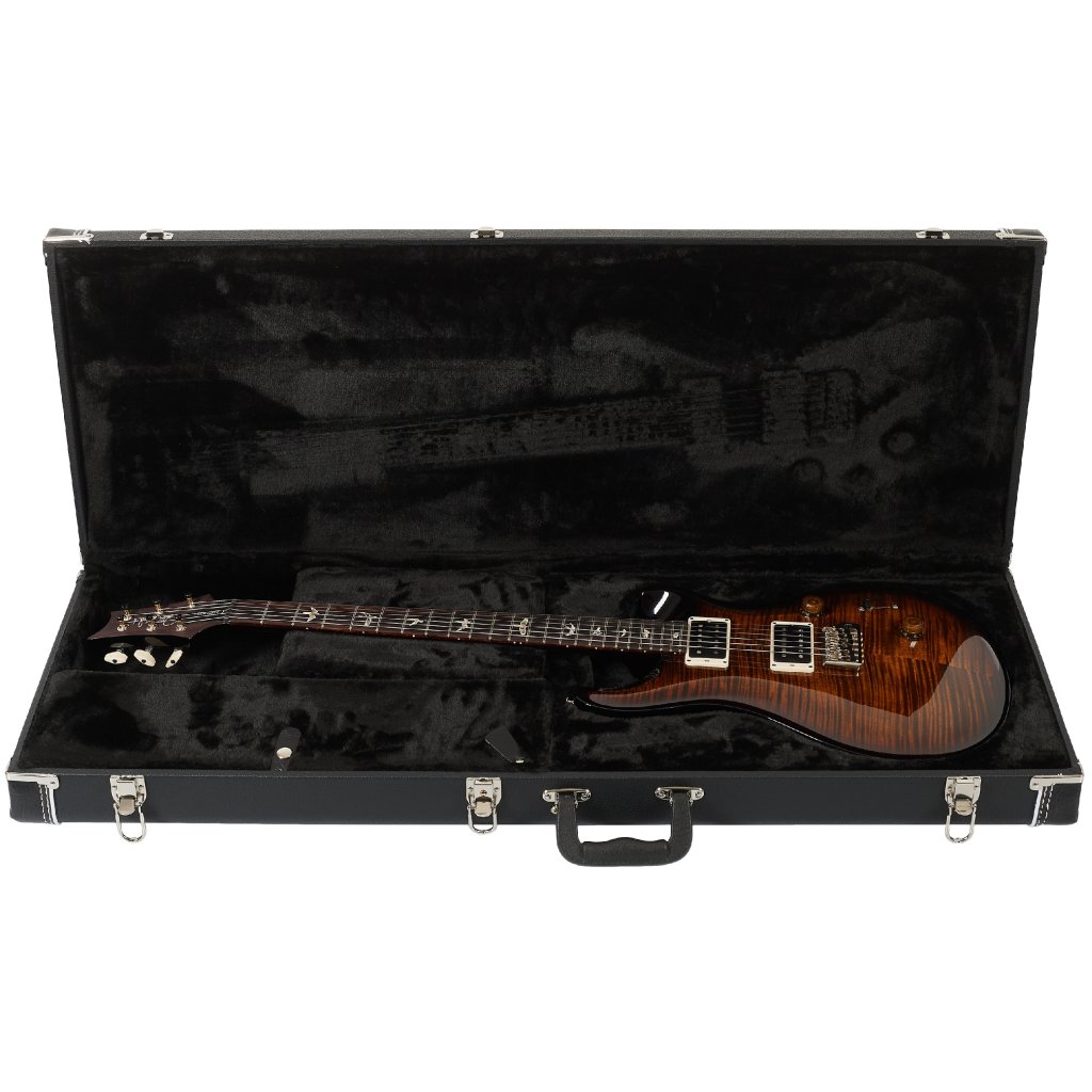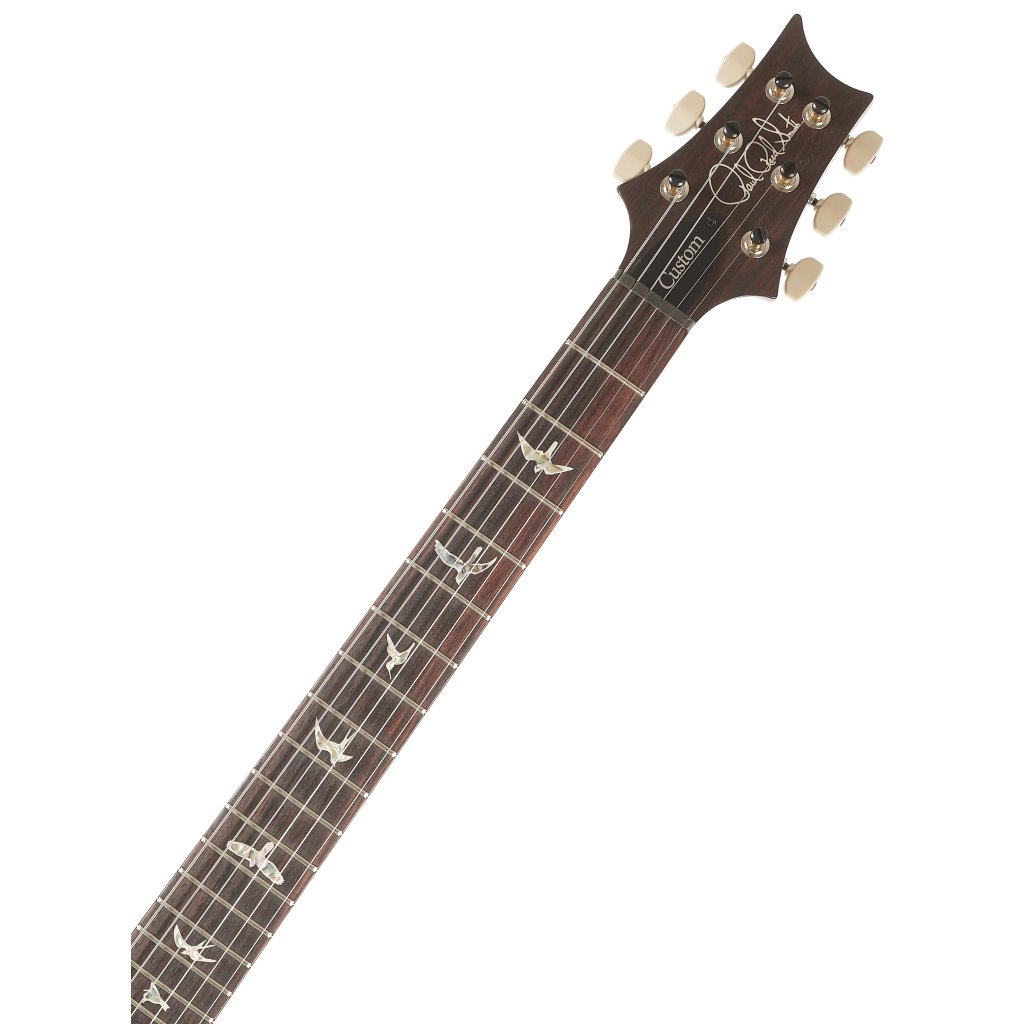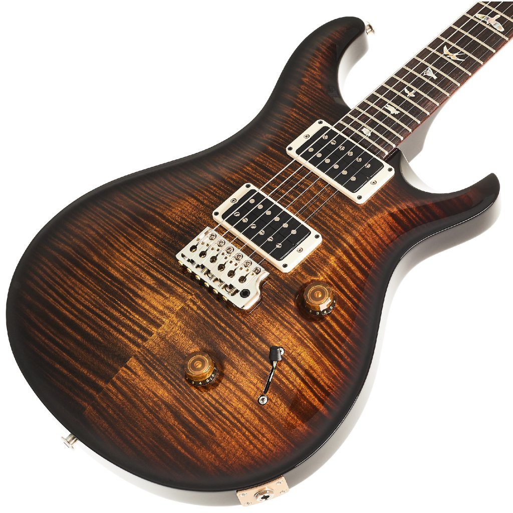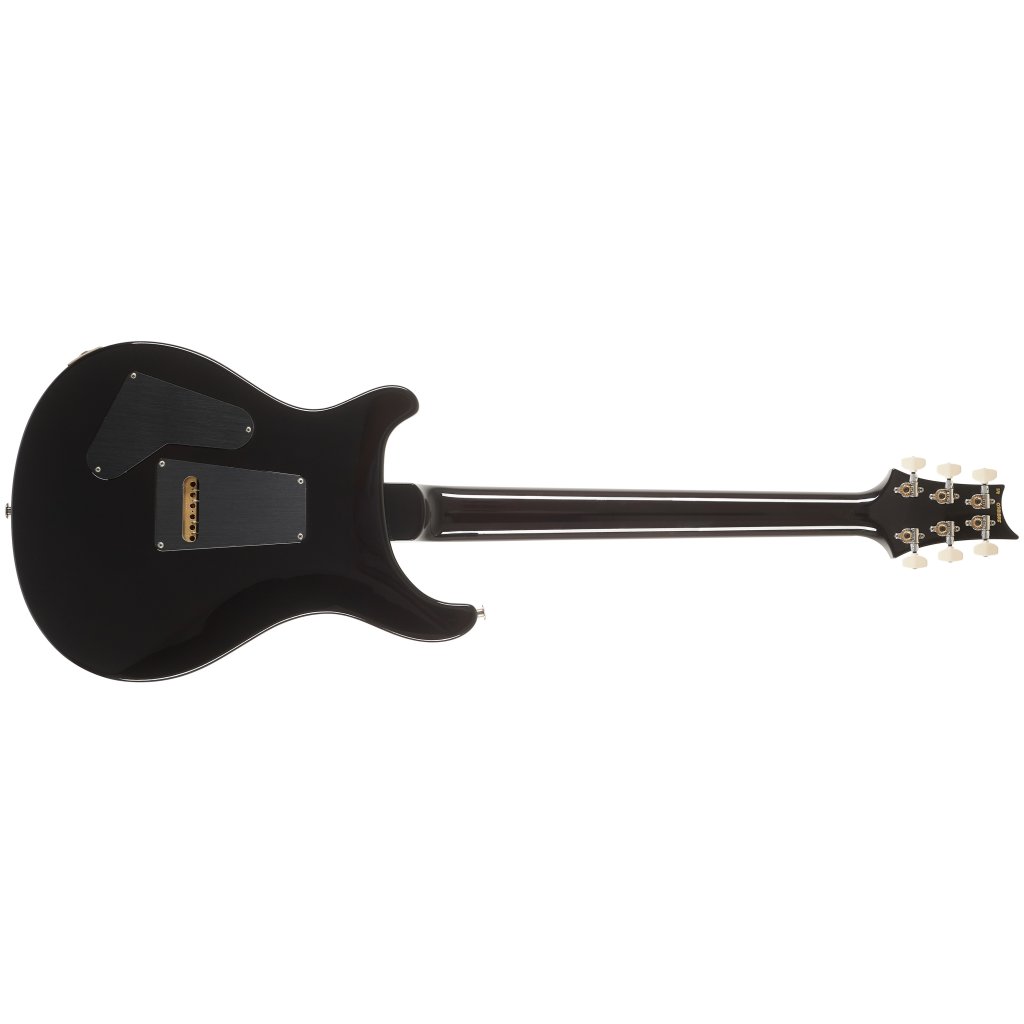 Model Custom 24 Black Gold Wraparound Burst už na první pohled upoutá kombinací ergonomicky tvarovaného mahagonového těla s typickým dvojitým PRS výřezem a topu z figurovaného javoru s parádní kresbou dřeva. Ke krku z jednoho kusu mahagonu s profilem Pattern Thin je přilepen palisandrový hmatník osazený čtyřiadvaceti pražci. Orientaci na hmatníku usnadňují trademark PRS polohové značky v podobě perleťových ptačích siluet.