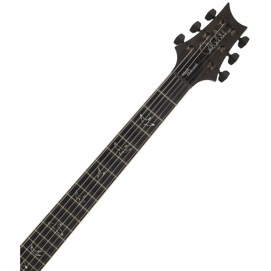 Mahagonové tělo elektrické kytary Mark Holcomb Charcoal Wraparound Burst v tradičním PRS double-cut designu zdobí top z mangovníku. Kresbu dřeva zvýrazňuje efektní barevná úprava Charcoal Wraparound Burst a saténový nitrolak. Ke krku z jednoho kusu javoru s custom profilem je přilepen ebenový hmatník osazený čtyřiadvaceti pražci. Specifikem kytary je plochý rádius hmatníku (20 palců), který bude vyhovovat rychlým technicky zdatným hráčům. Orientaci na hmatníku usnadňují polohové značky v podobě perleťových ptačích siluet.
