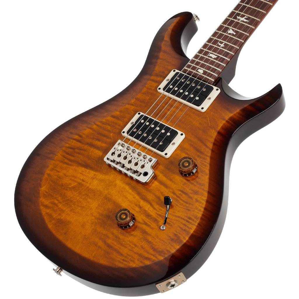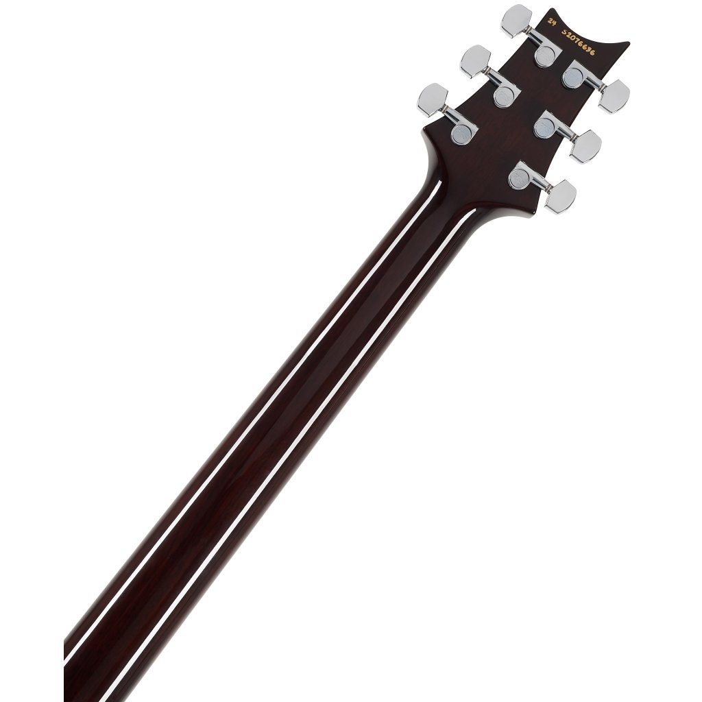 Mahagónové telo gitary S2 Custom 24 Black Amber s charakteristickým dizajnom PRS s dvojitým výrezom zdobí efektná figúrovaná javorová vrchná doska podporená farebne zladenou povrchovou úpravou a lesklou nitro povrchovou úpravou. Výrazne skosené hrany tela podporujú celkovú ergonómiu hry. K mahagónovému krku s profilom Pattern Thin je prilepený palisandrový hmatník osadený dvadsiatimi štyrmi pražcami. Orientáciu na hmatníku uľahčujú polohové značky v podobe perleťových siluet vtákov.