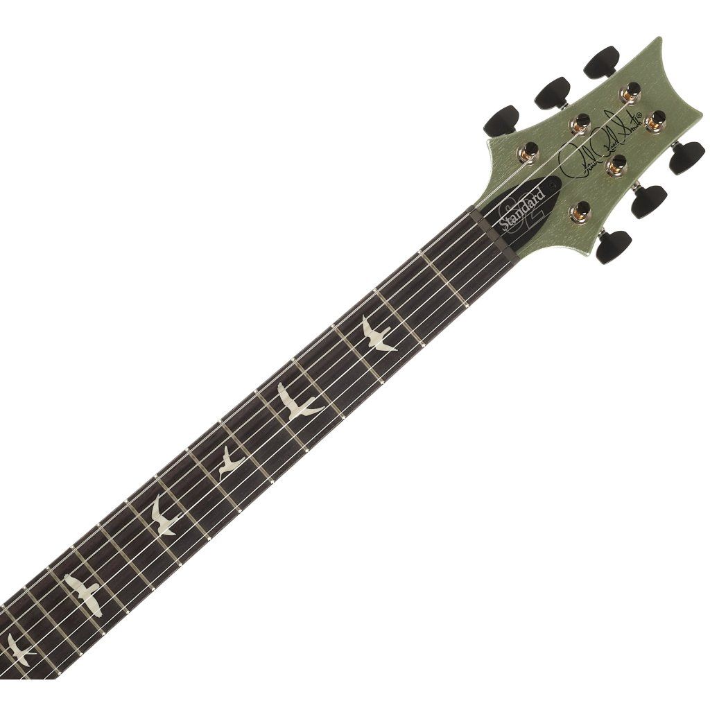Mahagónové telo gitary S2 Standard 24 Satin Mavis Mint Metallic je pokryté tenkou vrstvou saténového nitrocelulózového laku. Mahagónový krk s profilom Pattern Thin je vybavený palisandrovým hmatníkom s dvadsiatimi štyrmi pražcami. Polohové značky v podobe siluet vtákov uľahčujú orientáciu na hmatníku.