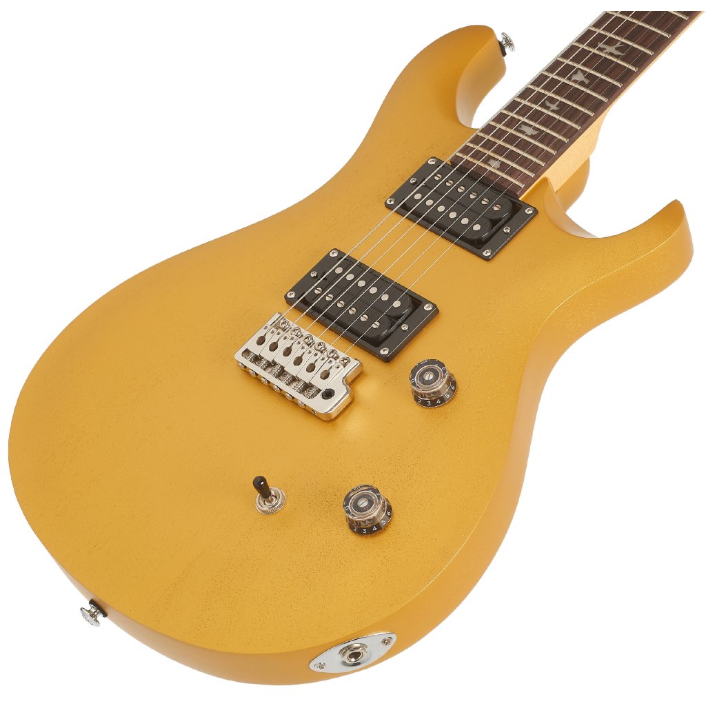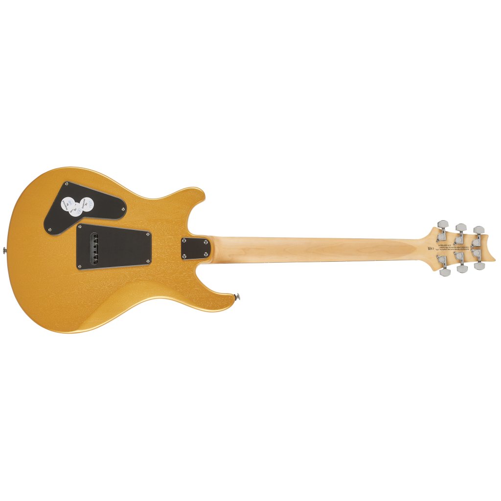 Tělo kytary SE CE24 Standard Satin Metallic Gold je zhotoveno z mahagonu. Výřez Shallow Violin carve přibližuje kvalitou herní vlastnosti nástroje k dražším americkým modelům série Core. K javorovému krku s profilem Wide Thin je přilepen palisandrový hmatník osazený čtyřiadvaceti pražci. Orientaci na hmatníku usnadňují polohové značky v podobě perleťových ptačích siluet.