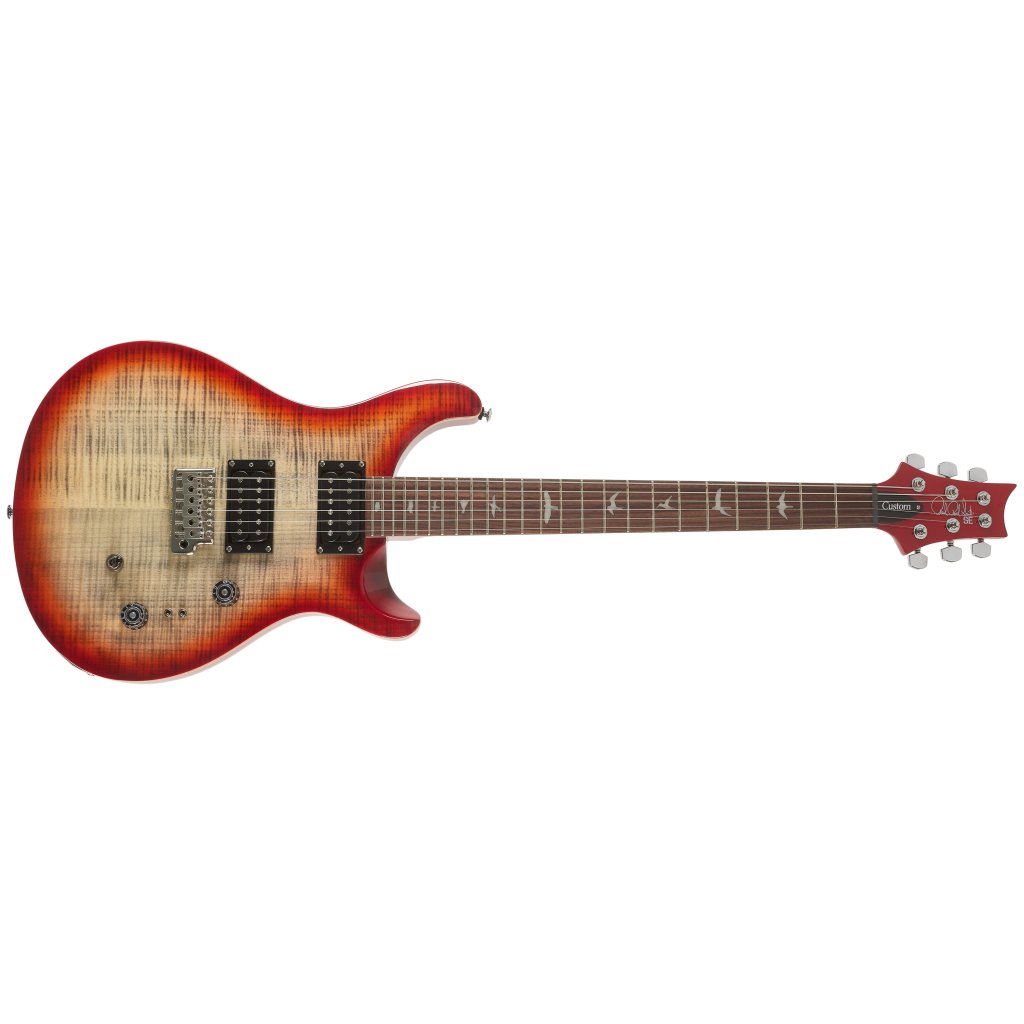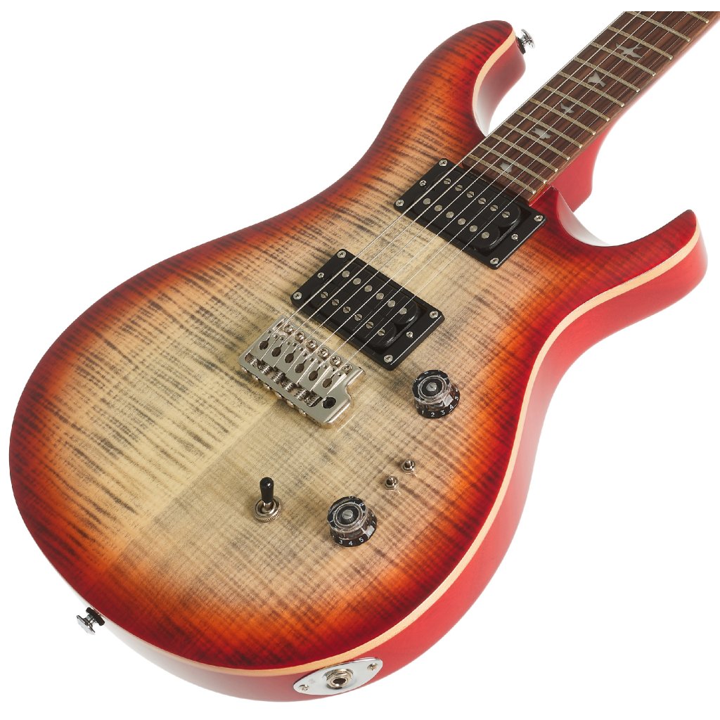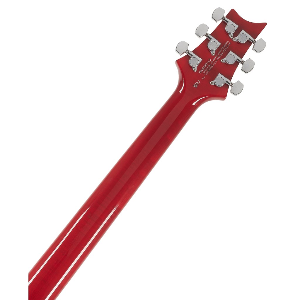 Mahagonové tělo kytary SE Custom 24-08 Charcoal Cherry Burst zdobí javorový top a efektní vrchní dýha fládrovaného javoru. Výřez Shallow Violin carve přibližuje kvalitou herní vlastnosti nástroje k dražším americkým modelům série Core. K javorovému krku s profilem Wide Thin je přilepen palisandrový hmatník osazený čtyřiadvaceti pražci. Orientaci na hmatníku usnadňují polohové značky v podobě perleťových ptačích siluet.