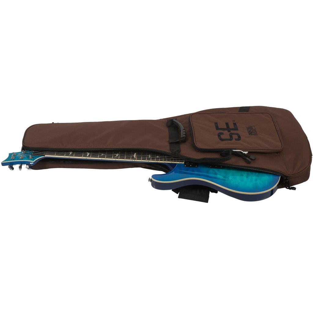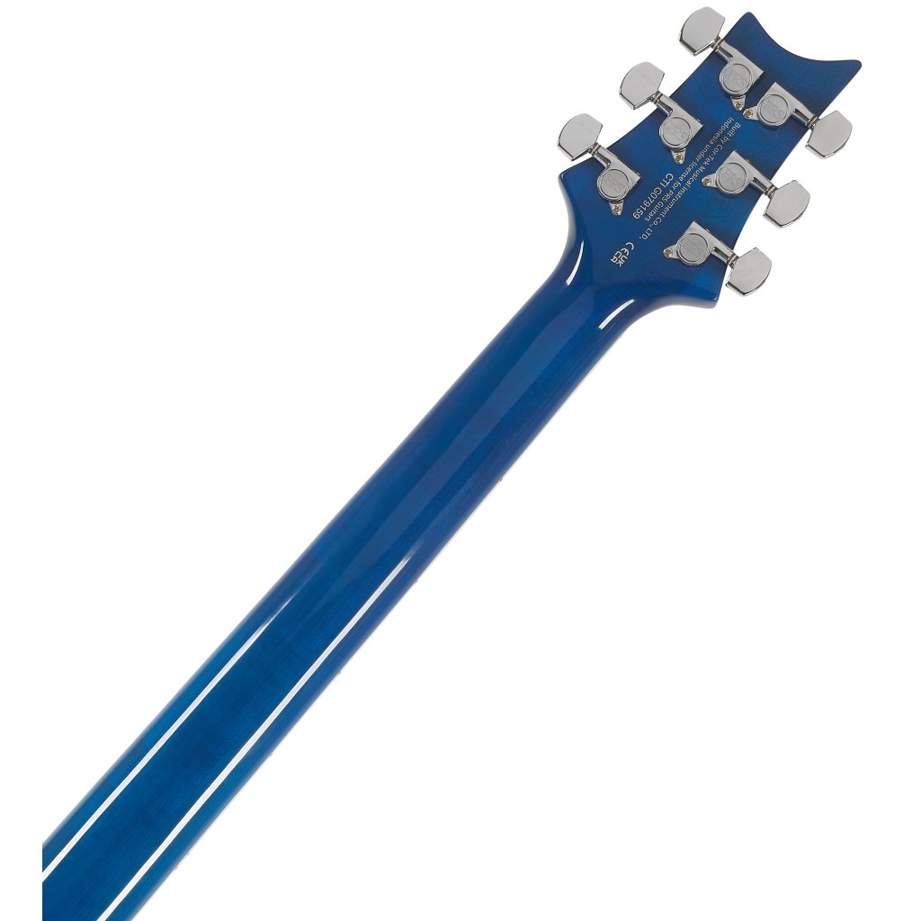 Mahagonové tělo kytary SE Custom 24-08 Quilt Package Lake Blue zdobí javorový top a efektní vrchní dýha z obláčkového javoru. Výřez Shallow Violin carve přibližuje kvalitou herní vlastnosti nástroje k dražším americkým modelům série Core. K javorovému krku s profilem Wide Thin je přilepen ebenový hmatník osazený čtyřiadvaceti pražci. Orientaci na hmatníku usnadňují polohové značky v podobě perleťových ptačích siluet.
