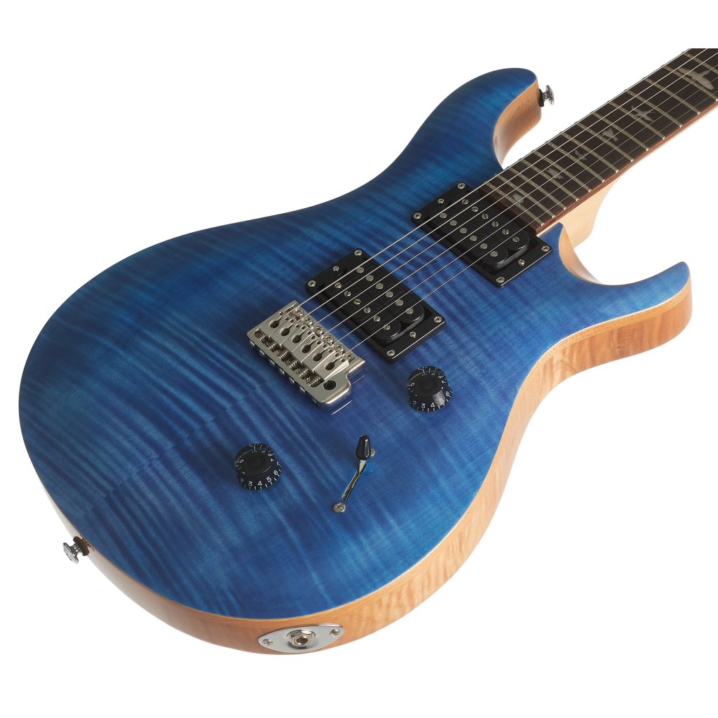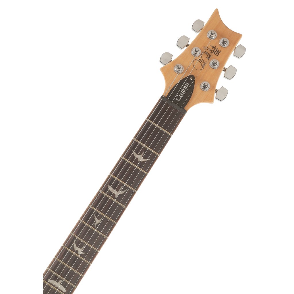 Mahagonové tělo kytary SE CUSTOM 24 Faded Blue zdobí javorový top a efektní vrchní dýha fládrovaného javoru. Výřez Shallow Violin carve přibližuje kvalitou herní vlastnosti nástroje k dražším americkým modelům série Core. K javorovému krku s profilem Wide Thin je přilepen palisandrový hmatník osazený čtyřiadvaceti pražci. Orientaci po ploše hmatníku usnadňují polohové značky v podobě perleťových ptačích siluet.
