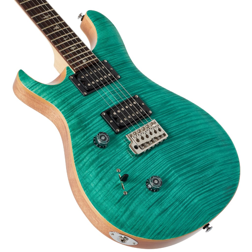 Mahagonové tělo kytary pro leváky SE LEFTY CUSTOM 24 Turquiose zdobí javorový top a efektní vrchní dýha fládrovaného javoru. Výřez Shallow Violin carve přibližuje kvalitou herní vlastnosti nástroje k dražším americkým modelům série Core. K javorovému krku s profilem Wide Thin je přilepen palisandrový hmatník osazený čtyřiadvaceti pražci. Orientaci po ploše hmatníku usnadňují polohové značky v podobě perleťových ptačích siluet.