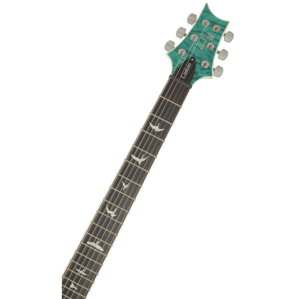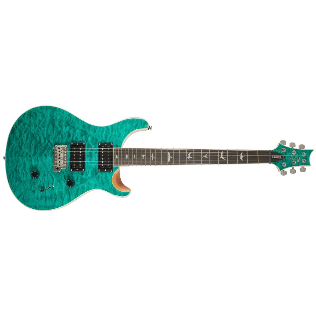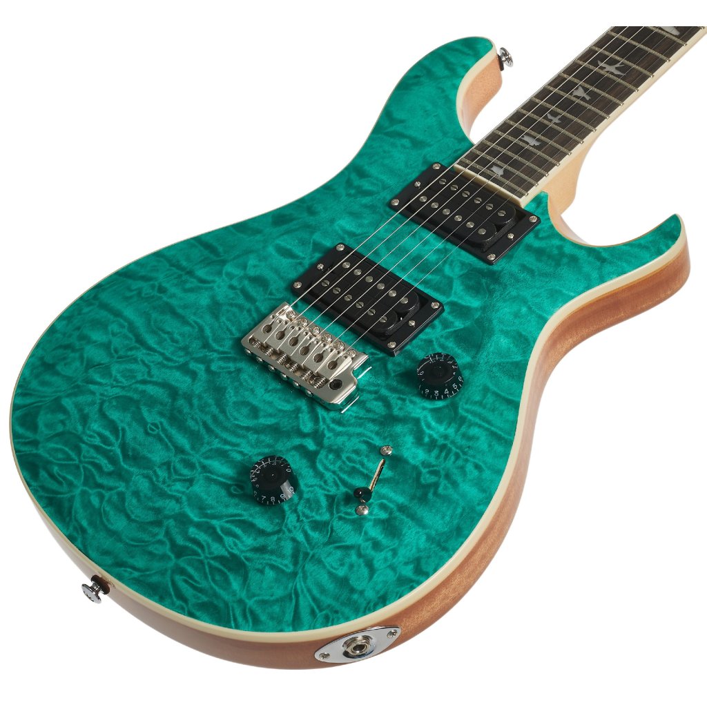 Mahagónové telo gitary SE Custom 24 Quilt Package Turquiose zdobí javorová vrchná doska a efektná vrchná doska z javorovej dyhy Cloud, ktorá je použitá aj na hlavici. Vyrezávanie Shallow Violin približuje hrateľnosť nástroja kvalitou drahším modelom americkej série Core. Ebenový hmatník osadený dvadsiatimi štyrmi pražcami je prilepený k javorovému krku s profilom Wide Thin. Orientáciu na hmatníku uľahčujú polohové značky v podobe perleťových siluet vtákov.
