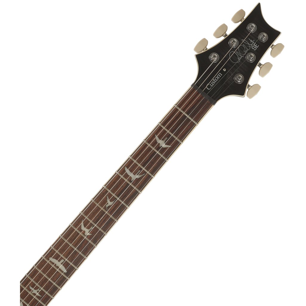 Mahagonové tělo kytary SE Custom 24 Semi-Hollow Piezo Charcoal Burst 2026 zdobí javorový top a efektní vrchní dýha fládrovaného javoru. Výřez Shallow Violin carve přibližuje kvalitou herní vlastnosti nástroje k dražším americkým modelům série Core. K javorovému krku s profilem Wide Thin je přilepen palisandrový hmatník osazený čtyřiadvaceti pražci. Orientaci na hmatníku usnadňují polohové značky v podobě ptačích siluet.