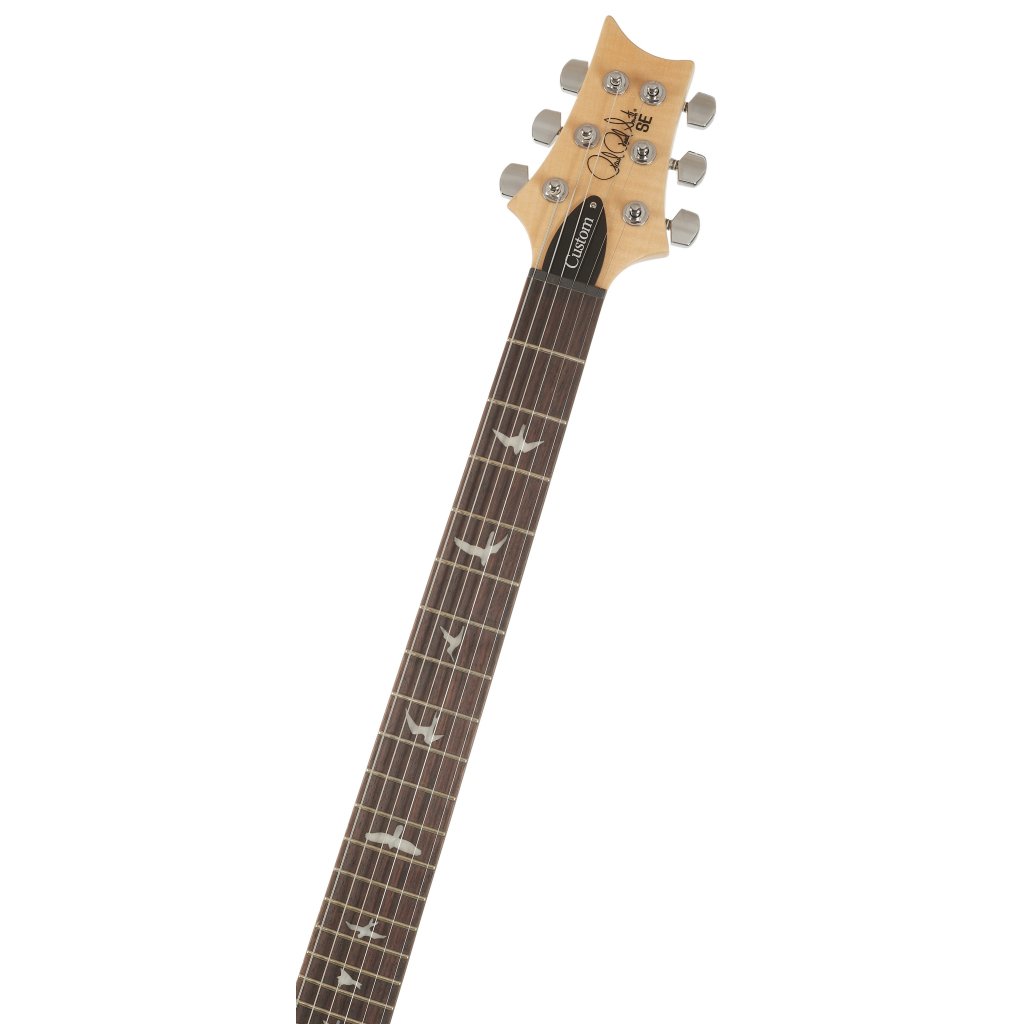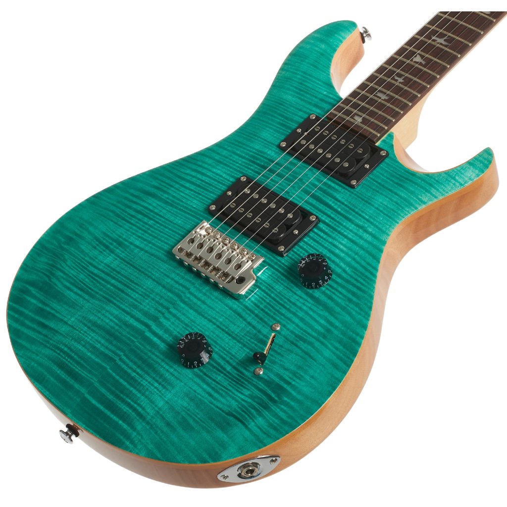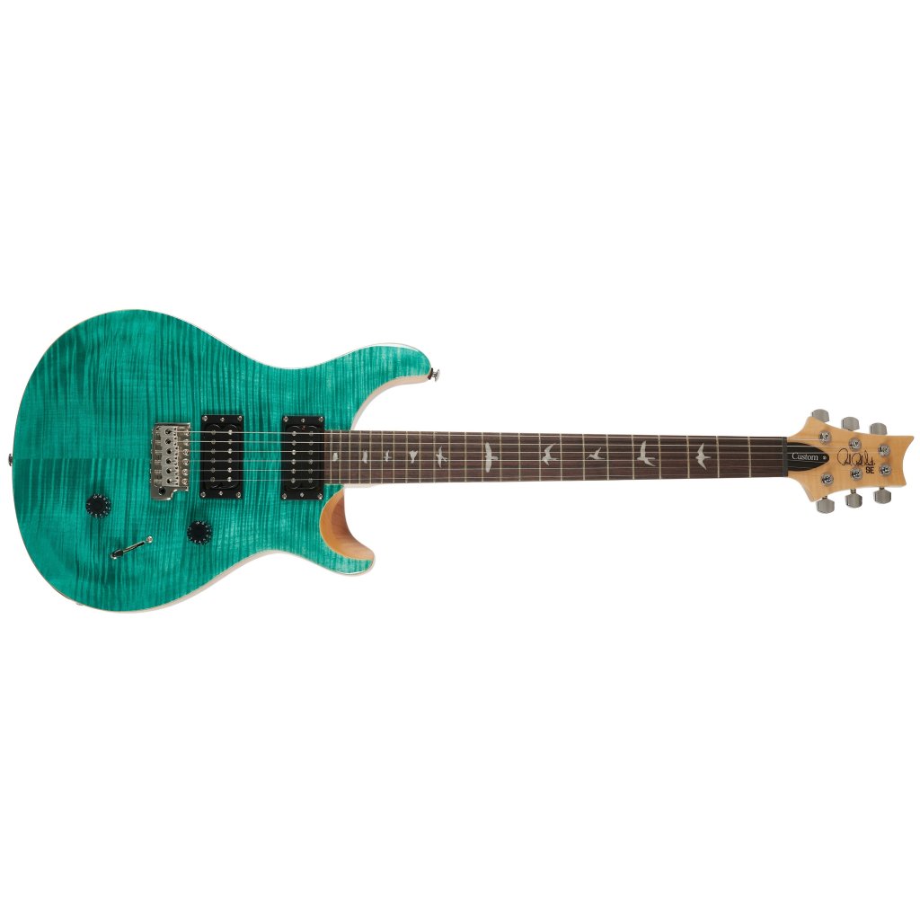 Mahagónové telo modelu SE Custom 24 Turquiose zdobí javorová vrchná doska a efektná dyha z fládrovaného javora. Vyrezávanie Shallow Violin približuje kvalitu hry nástroja drahším modelom americkej série Core. Palisandrový hmatník s dvadsiatimi štyrmi pražcami je prilepený k javorovému krku s profilom Wide Thin. Orientáciu na hmatníku uľahčujú polohové značky v podobe perleťových siluet vtákov.