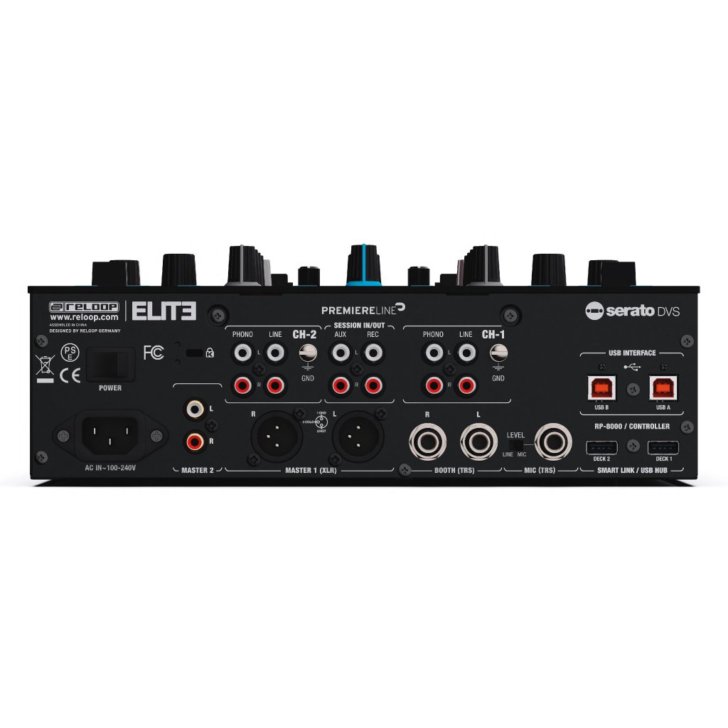Zadná strana ponúka vstupy RCA na pripojenie hudobných prehrávačov alebo iného DJ príslušenstva, vstup pre mikrofón, výstupy XLR/RCA na ozvučenie PA, výstupy USB na pripojenie k PC a dva vstupy USB pre Reloop RP-8000 MK2.