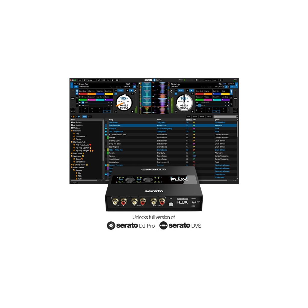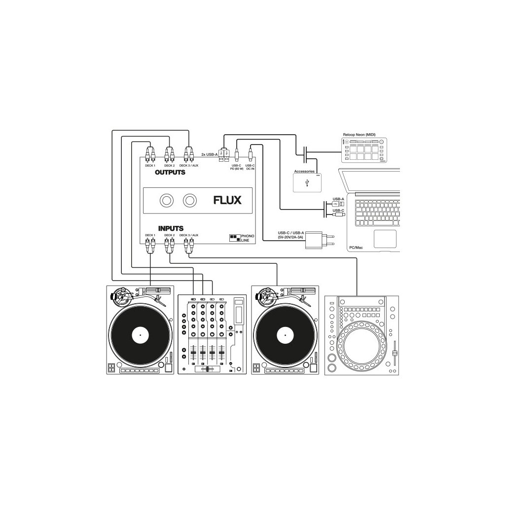 Reloop Flux je rozhranie USB-C DVS určené na použitie so Serato DJ Pro. Slúži na pripojenie ku gramofónom alebo iným prehrávačom. Na pripojenie sa používajú tri pozlátené stereo konektory RCA. K prehľadnej prevádzke prispievajú jasné LED diódy.