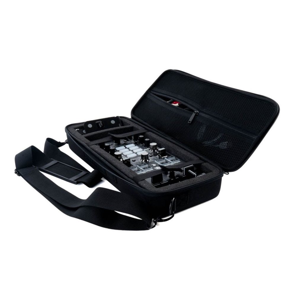 Taška má na hornej strane vybrácie, ktoré slúžia ako protišmyková a vyvýšená základňa pre Reloop Mixtour Pro. Praktická priehradka ponúka priestor na napájaciu jednotku alebo powerbanku a má integrované sieťované vrecko s popruhom na pripevnenie káblov a ďalšieho príslušenstva. Ovládač možno tiež bezpečne upevniť pomocou dvoch pásikov na suchý zips.