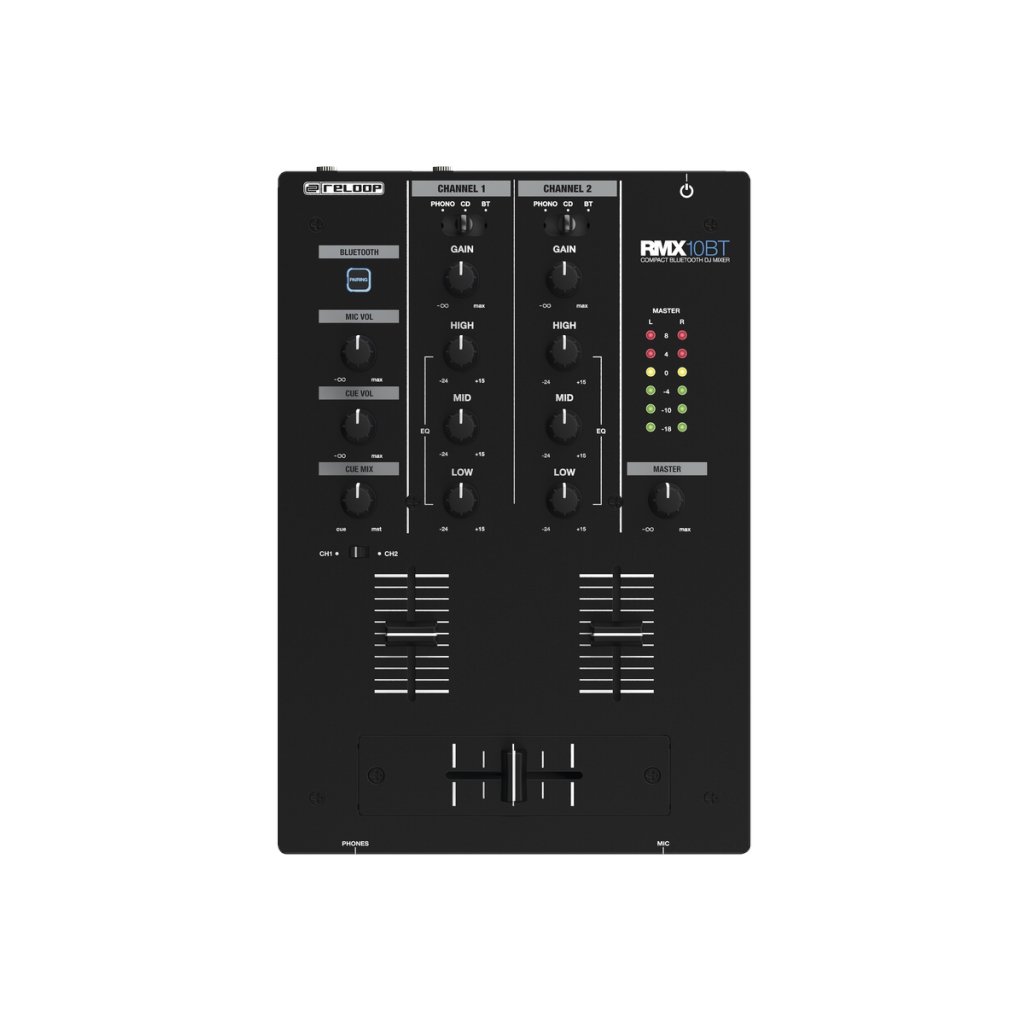 Reloop RMX-10BT pozostáva z ovládacieho panela, na ktorom nájdete tri 45 mm fadery, z ktorých dva slúžia na mixovanie vstupného signálu a jeden má funkciu crossfadera. Signál môžete ďalej upravovať pomocou trojpásmového ekvalizéra a ovládača hlasitosti. Informácie o hlasitosti vám potom sprostredkuje šesťúrovňový indikátor LED. Na prednej strane nájdete výstup na slúchadlá a vstup pre mikrofón, ktorý je vhodný napríklad na hovorené slovo a karaoke párty.