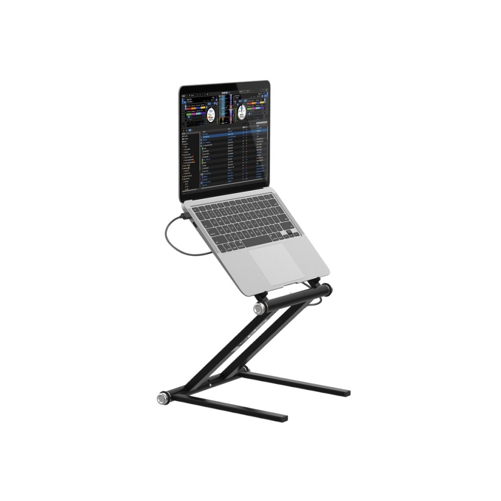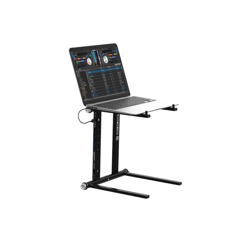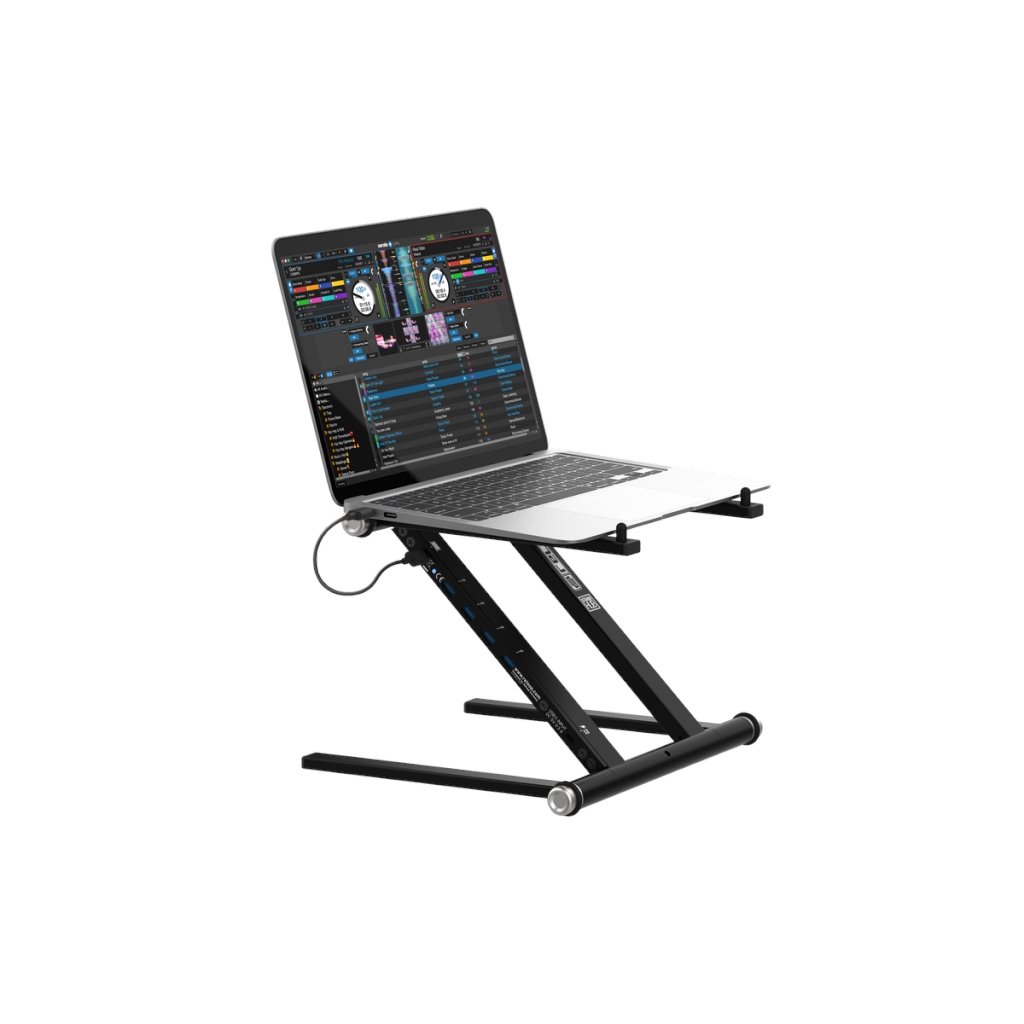 Vysokokvalitný stojan na notebook a tablet, ktorý obsahuje napájací pásik USB a je vhodný pre DJ-ov do štúdia alebo na živé vystúpenia. Má dizajn kompatibilný so všetkými súčasnými veľkosťami notebookov (11"-18") a pogumované prvky, ktoré zabraňujú pohybu a vibráciám.