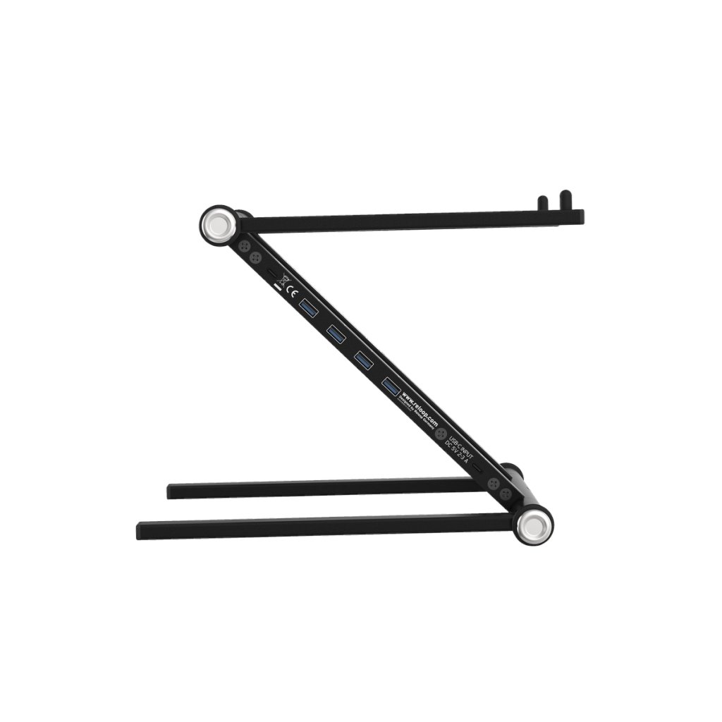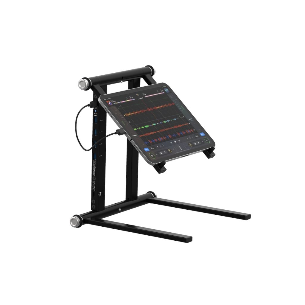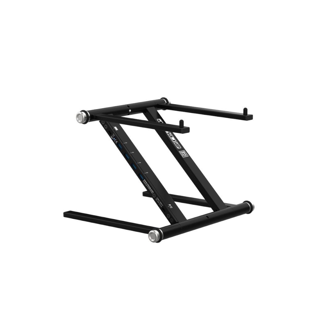Vysokokvalitný stojan na notebook a tablet, ktorý obsahuje napájací pásik USB a je vhodný pre DJ-ov do štúdia alebo na živé vystúpenia. Má dizajn kompatibilný so všetkými súčasnými veľkosťami notebookov (11"-18") a pogumované prvky, ktoré zabraňujú pohybu a vibráciám.