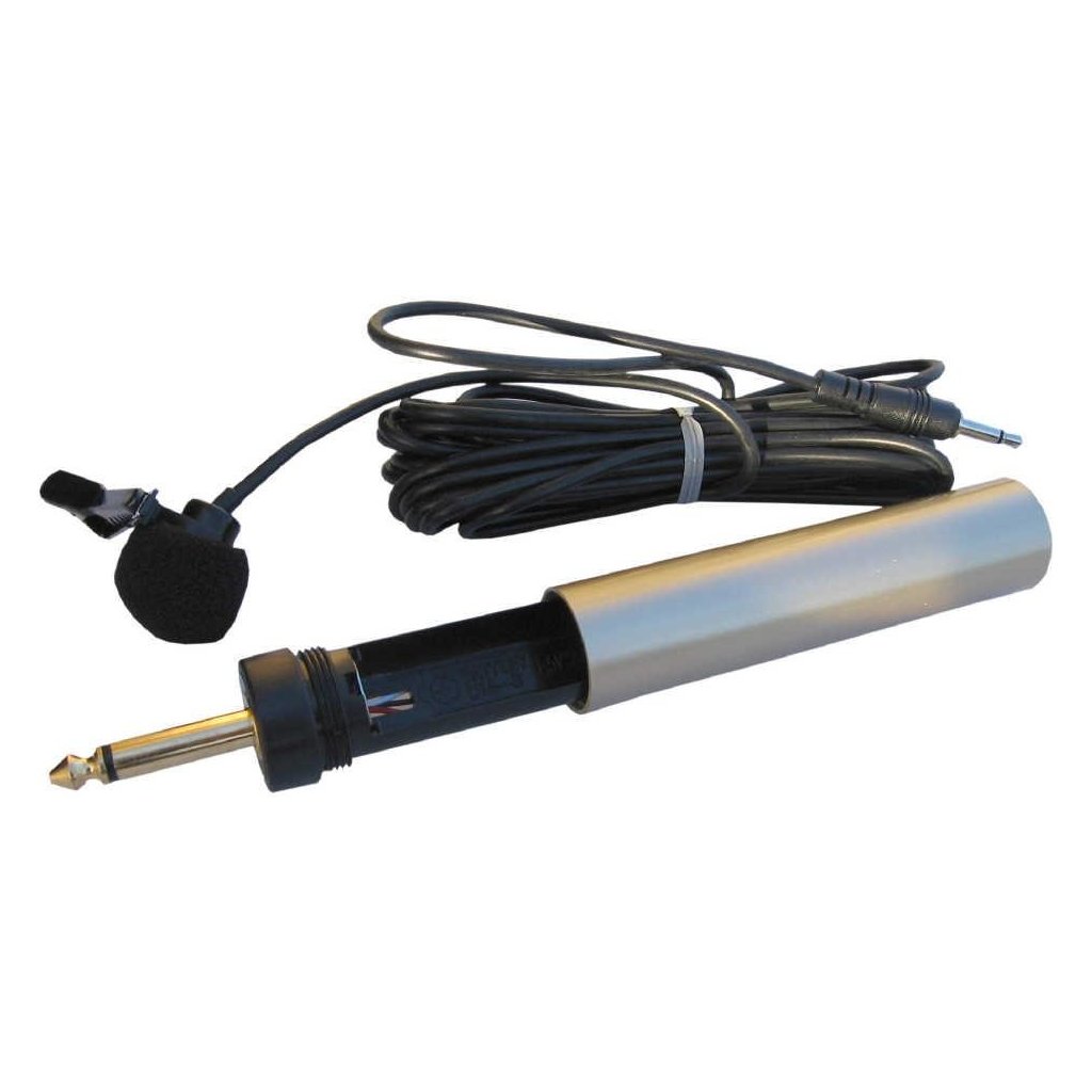 Kravatový mikrofón s kondenzátorovou vložkou. Štipcový držiak. Valcové púzdro pre tužkovú batériu s konektorom JACK 6,3 mm pre zasunutie do mixu a so zásuvkou 3,5 mm pre pripojenie káblika od mikrofónu. Molitanová krytka.