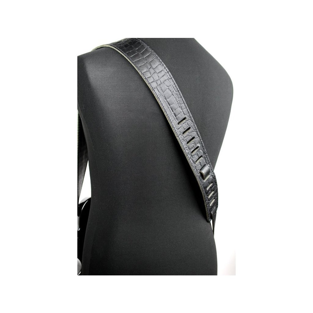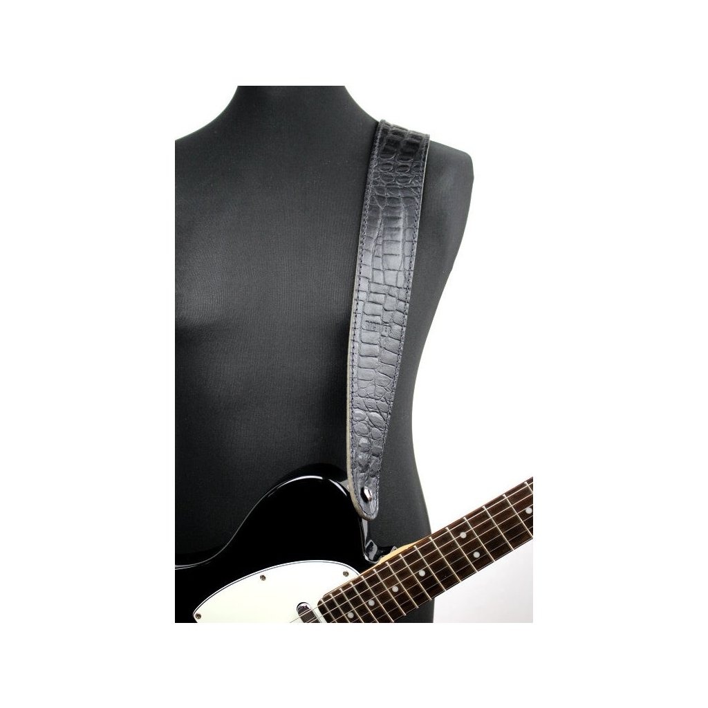Exkluzívny gitarový popruh z byvolej kože. Šírka 6 centimetrov a hrúbka 3,5 - 4 milimetre poskytnú dostatočný komfort aj pri dlhom hraní, originálny dizajn zabezpečuje krokodílí vzor a prešívanie remeňa.