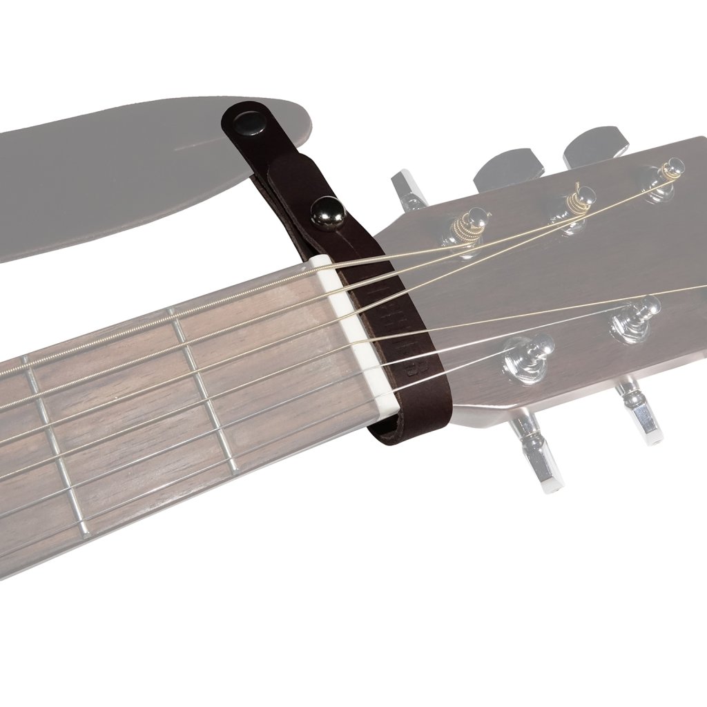 Praktický doplnok pre hráčov na klasickú a akustickú gitaru alebo basgitaru, ktorí nemajú druhú rukoväť na popruh. Je vyrobený z pravej kože a po navlečení pod struny na hlave gitary ho možno ľahko pripevniť k bežnému popruhu bez vŕtania do tela gitary.