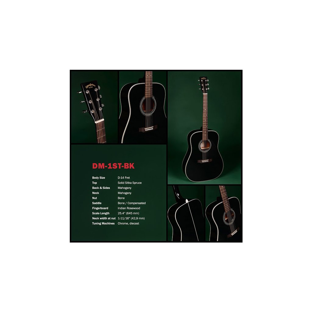 Tento nástroj je teda kombináciou tvaru dreadnought, masívna hornej dosky z amerického smreku Sitka a krk, luby a zadná doska je z mahagónu. Práve to z neho robí ideálnu univerzálnu gitaru. DM-1 ST-BK je navyše osadená kosteným nultým pražcom a kosteným kobylkovým sedlom, čo nie je obvyklé ani u drahších nástrojov konkurenčných značiek. Kosť, ako rýdzo prírodný materiál v prípade tohto modelu zaručuje vynikajúci prenos výšok a pevnosť tónu (aj tie najlepšie plasty znejú predsa len tak trochu gumovo). Gitara znie zreteľne a bohato pri vybrnkávaní, zato v akordoch dokáže hrať dôrazne, plne a pritom aj vyrovnane. Charakter zvuku je čistý a výrazný. Perfektné továrenské nastavenie a s ňou úzko súvisiace pohodlnosť nástroja je tu úplnou samozrejmosťou.