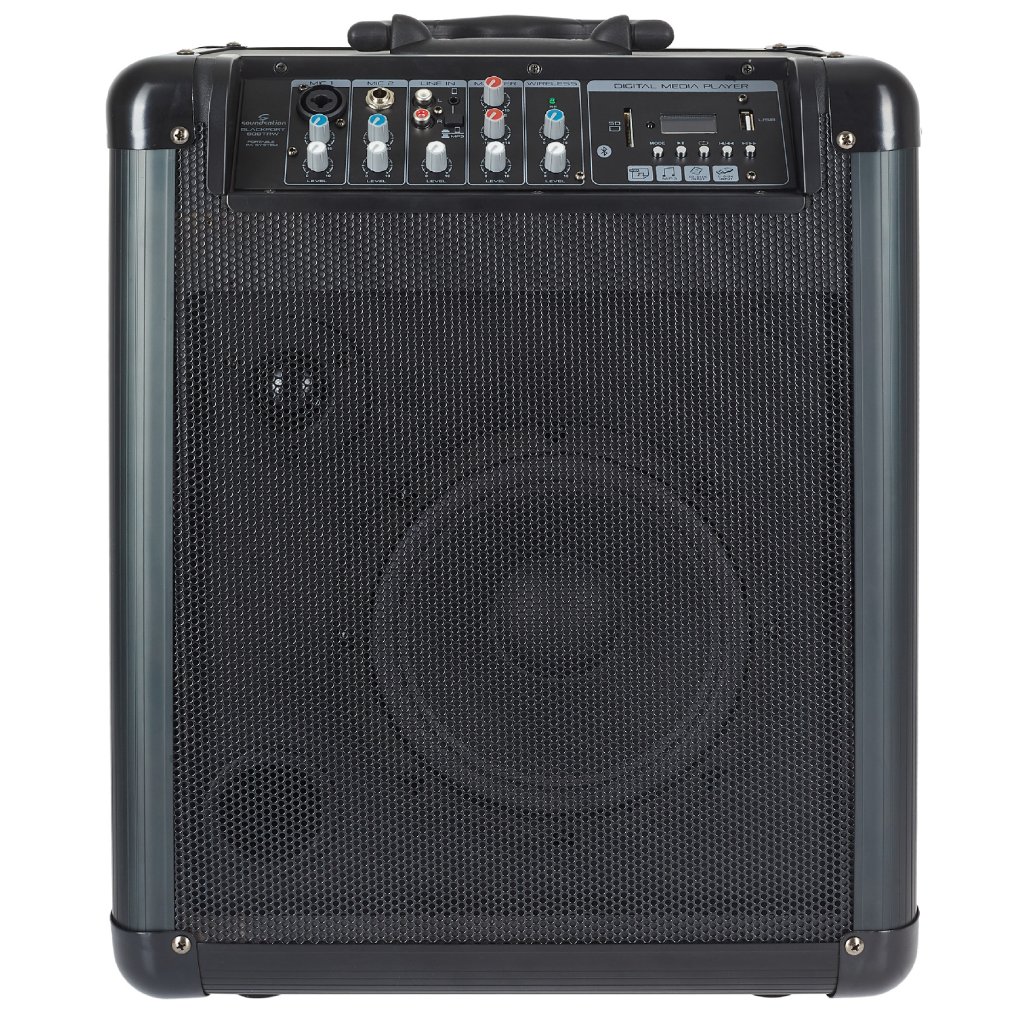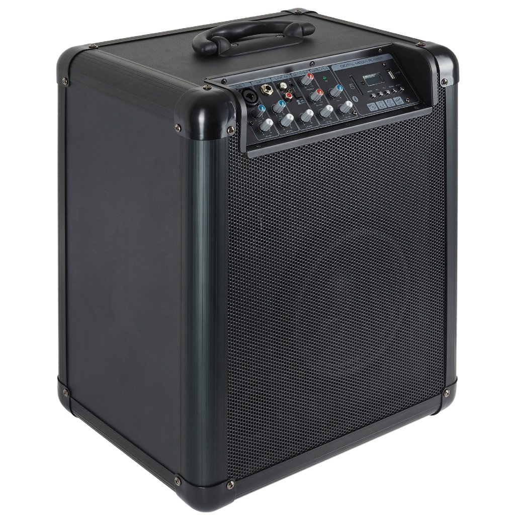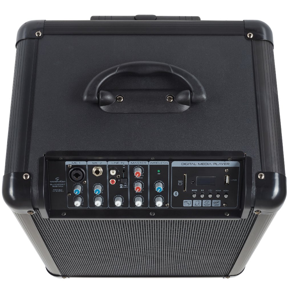 Mobilný zvukový systém Blackport ponúka bohaté vybavenie pre všetkých pouličných umelcov alebo hudobníkov na cestách. Príjemný výkon 80 W dopĺňa štvorkanálový mixážny pult so samostatným ovládaním hlasitosti, reverbom a dvojpásmovým ekvalizérom. Môžete pripojiť prakticky čokoľvek - nástroj, mikrofón alebo iný externý zdroj zvuku, dokonca aj cez Bluetooth. Obsahuje aj bezdrôtový mikrofón, integrovaný digitálny prehrávač s diaľkovým ovládaním a sloty na karty SD a USB. Dobíjateľná batéria s indikáciou stavu vydrží v prevádzke až 6 hodín. Robustnú konštrukciu na kolieskach dopĺňa praktická teleskopická rukoväť.