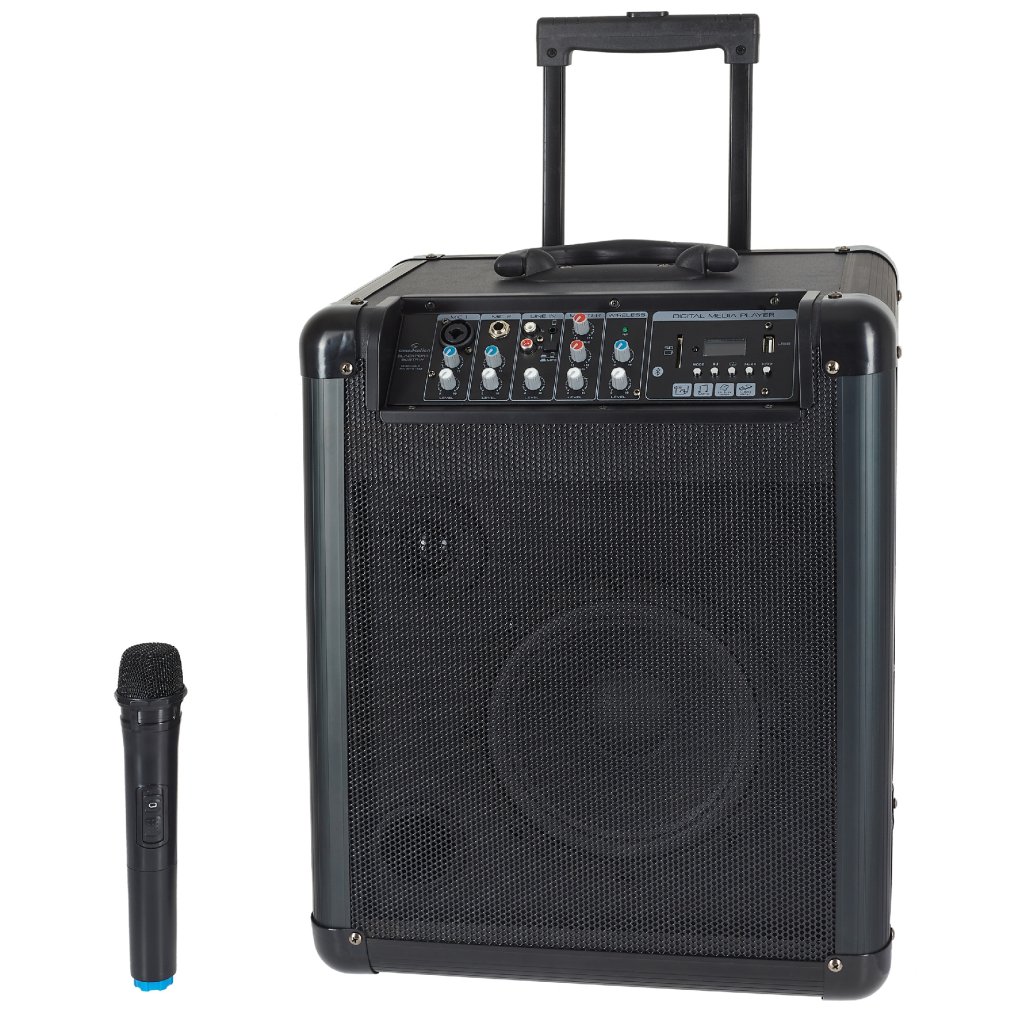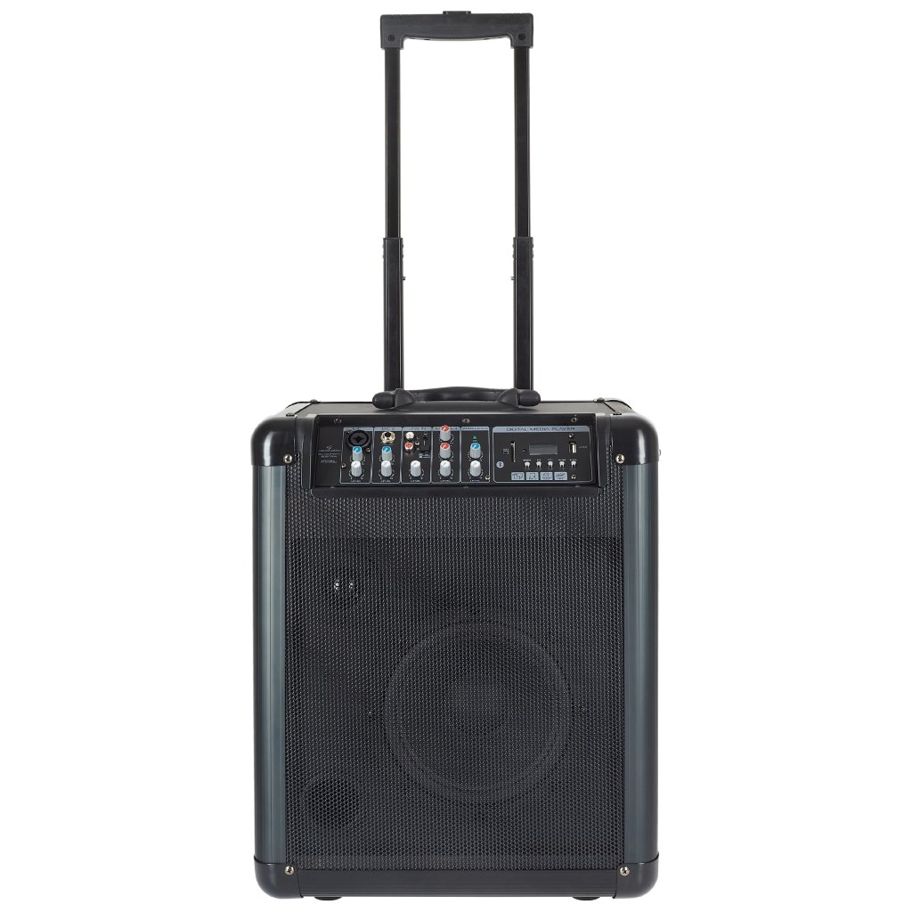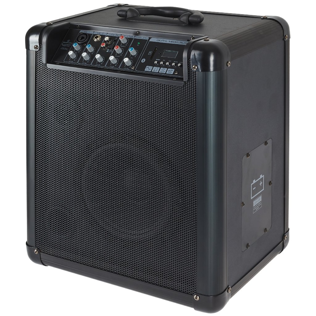 Mobilný zvukový systém Blackport ponúka bohaté vybavenie pre všetkých pouličných umelcov alebo hudobníkov na cestách. Príjemný výkon 80 W dopĺňa štvorkanálový mixážny pult so samostatným ovládaním hlasitosti, reverbom a dvojpásmovým ekvalizérom. Môžete pripojiť prakticky čokoľvek - nástroj, mikrofón alebo iný externý zdroj zvuku, dokonca aj cez Bluetooth. Obsahuje aj bezdrôtový mikrofón, integrovaný digitálny prehrávač s diaľkovým ovládaním a sloty na karty SD a USB. Dobíjateľná batéria s indikáciou stavu vydrží v prevádzke až 6 hodín. Robustnú konštrukciu na kolieskach dopĺňa praktická teleskopická rukoväť.