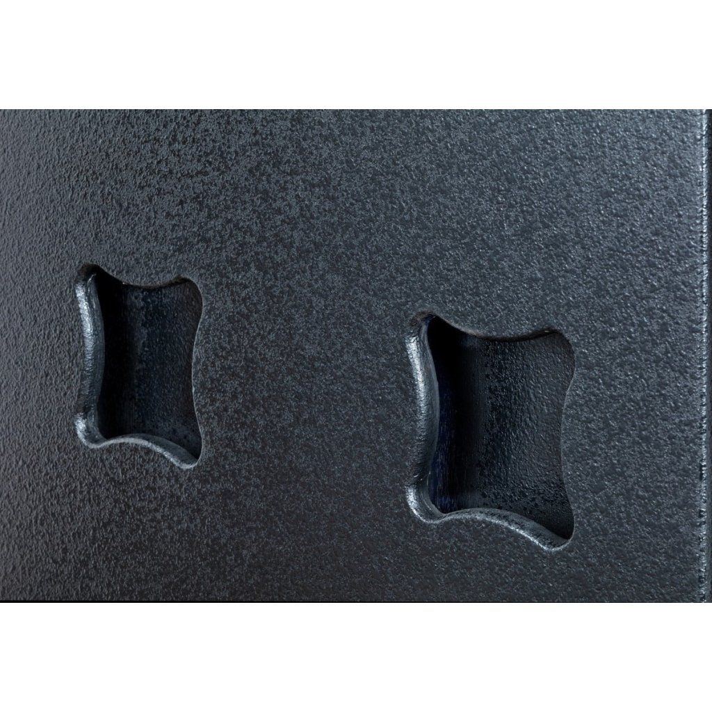 Konštrukcia je vyrobená z odolnej 18 mm preglejky a chránená pevnou oceľovou mriežkou, čo zaručuje vysokú odolnosť pri preprave aj náročnom nasadení. Praktické sú aj štyri zapustené rukoväte pre ľahkú manipuláciu a príruba M20/36 mm pre montáž satelitných reproduktorov. Na zadnej strane sa nachádzajú závity pre kolieska (voliteľné príslušenstvo), ktoré uľahčujú prepravu.